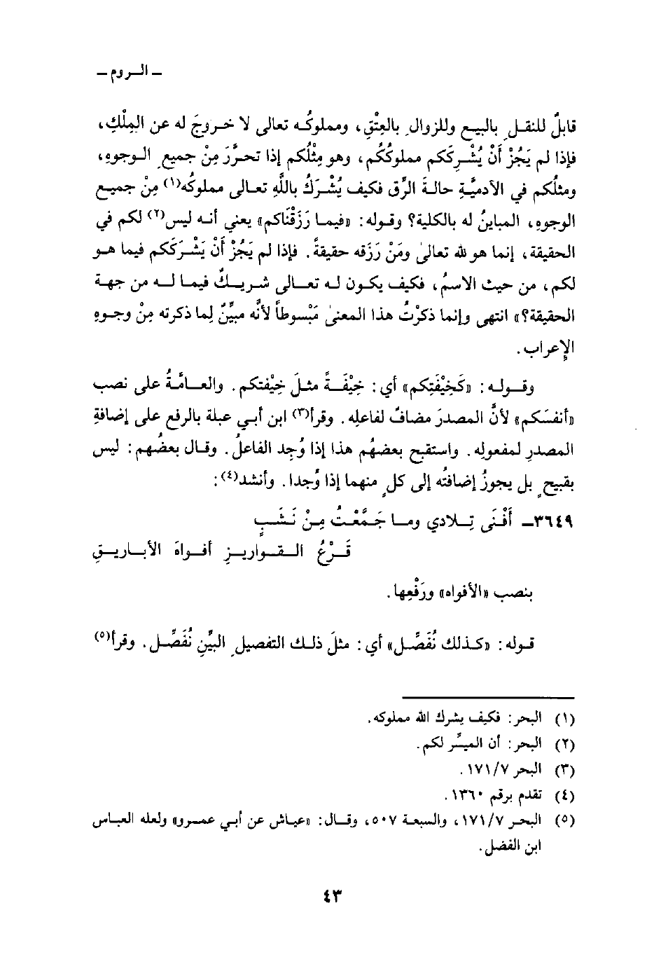 قابلٌ للنقلِ بالبيع وللزوالِ بالعِتْقِ، ومملوكُه تعالى لا خروجَ له عن المِلْكِ، فإذا لم يَجُزْ أَنْ يُشْرِكَكم مملوكُكُم، وهو مِثْلُكم إذا تحرَّرَ مِنْ جميعِ الوجوهِ، ومثلُكم في الآدميَّةِ حالةَ الرِّق فكيف يُشْرَكُ باللَّهِ تعالى مملوكُه مِنْ جميع الوجوهِ، المباينُ له بالكلية؟ وقوله: «فيما رَزَقْنَاكم» يعني أنه ليس لكم في الحقيقة، إنما هو لله تعالى ومَنْ رَزَقه حقيقةً. فإذا لم يَجُزْ أَنْ يَشْرَكَكم فيما هو لكم، من حيث الاسمُ، فكيف يكون له تعالى شريكٌ فيما له من جهة الحقيقة؟ «انتهى وإنما ذكرْتُ هذا المعنى مَبْسوطاً لأنَّه مبيِّنٌ لِما ذكرته مِنْ وجوهِ الإِعراب.