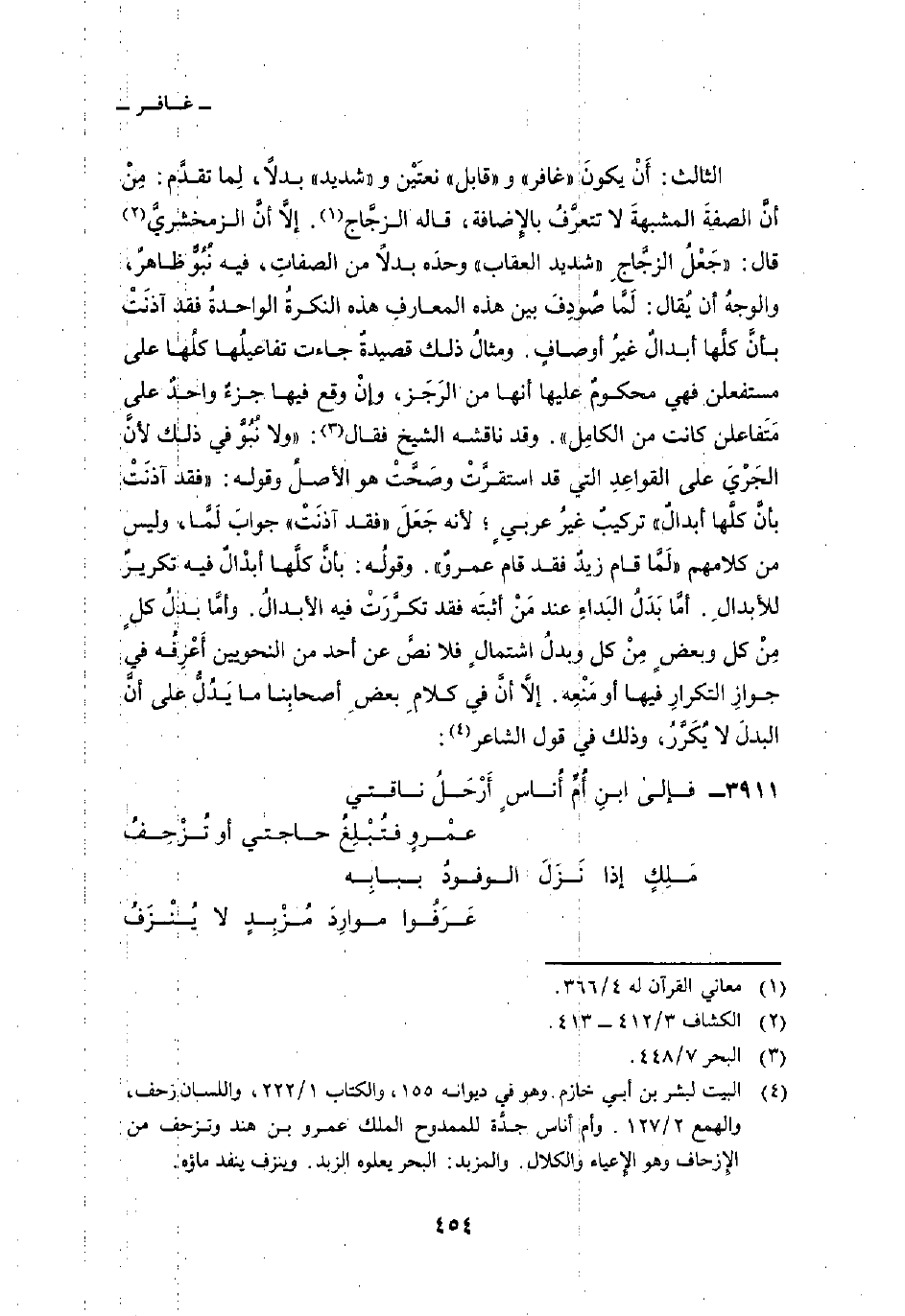 الثالث: أَنْ يكونَ «غافر» و «قابل» نعتَيْن و «شديد» بدلاً، لِما تقدَّم: مِنْ أنَّ الصفةَ المشبهةَ لا تتعرَّفُ بالإِضافة، قاله الزجَّاج. إلاَّ أنَّ الزمخشريَّ قال: «جَعْلُ الزجَّاجِ» شديد العقاب «وحدَه بدلاً من الصفاتِ، فيه نُبُوٌّ ظاهرٌ، والوجهُ أن يُقال: لَمَّا صُودِفَ بين هذه المعارفِ هذه النكرةُ الواحدةُ فقد آذنَتْ بأنَّ كلَّها أبدالٌ غيرُ أوصافٍ. ومثالُ ذلك قصيدةٌ جاءت تفاعيلُها كلُها على مستفعلن فهي محكومٌ عليها أنها من الرَجَز، وإنْ وقع فيها جزءٌ واحدٌ على مَتَفاعلن كانت من الكامِل» . وقد ناقشه الشيخ فقال: «ولا نُبُوَّ في ذلك لأنَّ الجَرْيَ على القواعِدِ التي قد استقرَّتْ وصَحَّتْ هو الأصلُ وقوله:» فقد آذنَتْ بأنَّ كلّها أبدالٌ «تركيبٌ غيرُ عربيٍ؛ لأنه جَعَل» فقد آذنَتْ «جوابَ لَمَّا، وليس من كلامهم» لَمَّا قام زيدٌ فقد قام عمروٌ «. وقولُه: بأنَّ كلَّها أبدْالٌ فيه تكريرٌ للأبدالِ. أمَّا بَدَلُ البَداءِ عند مَنْ أثبتَه فقد تكرَّرَتْ فيه الأبدالُ. وأمَّا بدلُ كلٍ مِنْ كل وبعضٍ مِنْ كل وبدلُ اشتمالٍ فلا نصَّ عن أحد من النحويين أَعْرِفُه في جوازِ التكرارِ فيها أو مَنْعِه. إلاَّ أنَّ في كلامِ بعضِ أصحابِنا ما يَدُلُّ على أنَّ البدلَ لا يُكَرَّرُ، وذلك في قول الشاعر: