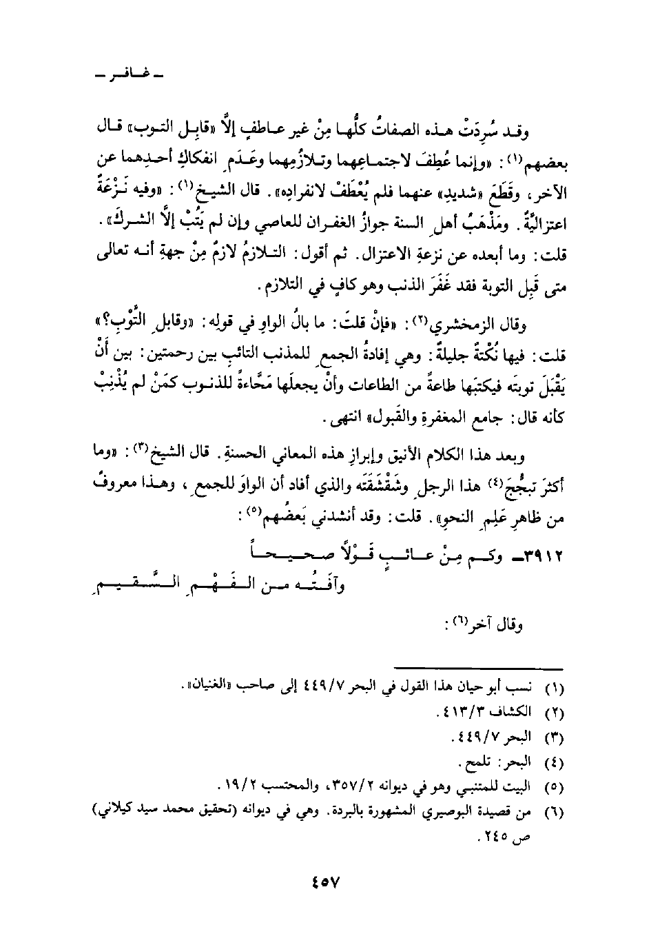 وقد سُرِدَتْ هذه الصفاتُ كلُّها مِنْ غير عاطفٍ إلاَّ «قابِل التوب» قال بعضهم: «وإنما عُطِفَ لاجتماعِهما وتلازُمِهما وعَدَمِ انفكاكِ أحدِهما عن الآخر، وقَطَعَ» شديدِ «عنهما فلم يُعْطَفْ لانفرادِه» . قال الشيخ: «وفيه نَزْعَةٌ اعتزاليَّةٌ. ومَذْهَبُ أهلِ السنة جوازُ الغفران للعاصي وإن لم يَتُبْ إلاَّ الشركَ» . قلت: وما أبعده عن نزعةِ الاعتزال. ثم أقول: التلازمُ لازمٌ مِنْ جهةِ أنه تعالى متى قَبِل التوبة فقد غَفَرَ الذنب وهو كافٍ في التلازم.