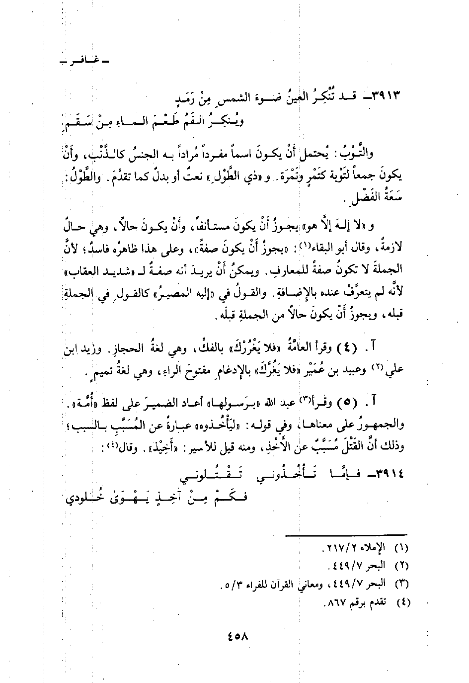 و {لاَ إله إِلاَّ هُوَ} يجوزُ أَنْ يكون مستأنفاً، وأَنْ يكونَ حالاً، وهي حالٌ لازمةٌ، وقال أبو البقاء: «يجوزُ أَنْ يكونَ صفةً» ، وعلى هذا ظاهرُه فاسدٌ؛ لأنَّ الجملةَ لا تكونُ صفةً للمعارفِ. ويمكنُ أَنْ يريدَ أنه صفةٌ ل «شديد العقاب» لأنَّه لم يتعرَّفْ عنده بالإِضافةِ. والقولُ في «إليه المصيرُ» كالقولِ في الجملةِ قبله، ويجوزُ أَنْ يكونَ حالاً من الجملةِ قبلَه.