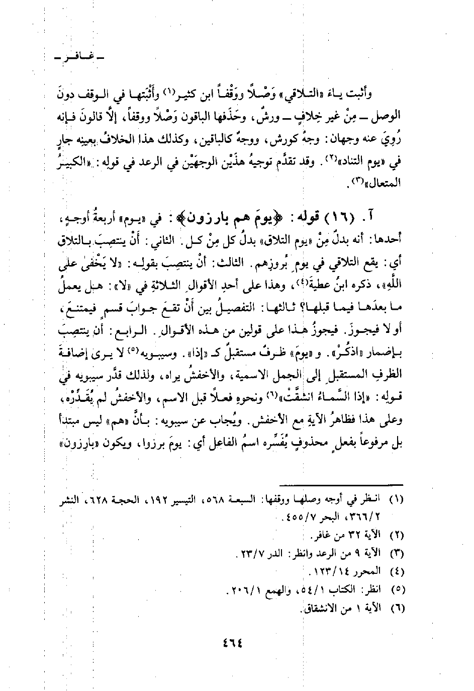 وأثبت ياءَ «التلاقي» وَصْلاً ووَقْفاً ابن كثير وأَثْبَتها في الوقف دونَ الوصل - مِنْ غير خِلافٍ - ورشٌ، وحَذَفها الباقون وَصْلاً ووقفاً، إلاَّ قالونَ فإنه رُوِيَ عنه وجهان: وجهٌ كورش، ووجهٌ كالباقين، وكذلك هذا الخلافُ بعينِه جارٍ في {يَوْمَ التناد} [غافر: 32] . وقد تقدَّم توجيهُ هذَيْن الوجهَيْن في الرعد في قولِه: {الكبير المتعال} [الرعد: 9] .