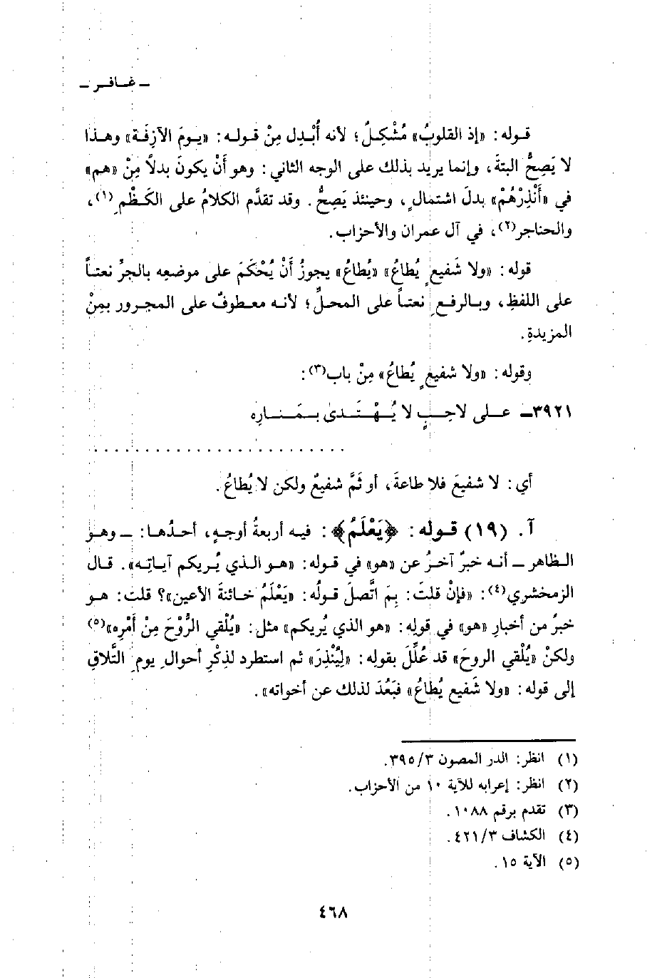 قوله:» إذ القلوبُ «مُشْكِلٌ؛ لأنه أُبْدِل مِنْ قوله:» يومَ الآزِفَة «وهذا لا يَصِحُّ البتةَ، وإنما يريد بذلك على الوجه الثاني: وهو أَنْ يكونَ بدلاً مِنْ» هم «في» أَنْذِرْهُمْ «بدلَ اشتمالٍ، وحينئذ يَصِحُّ. وقد تقدَّم الكلامُ على الكَظْمِ، والحناجر، في آل عمران والأحزاب.