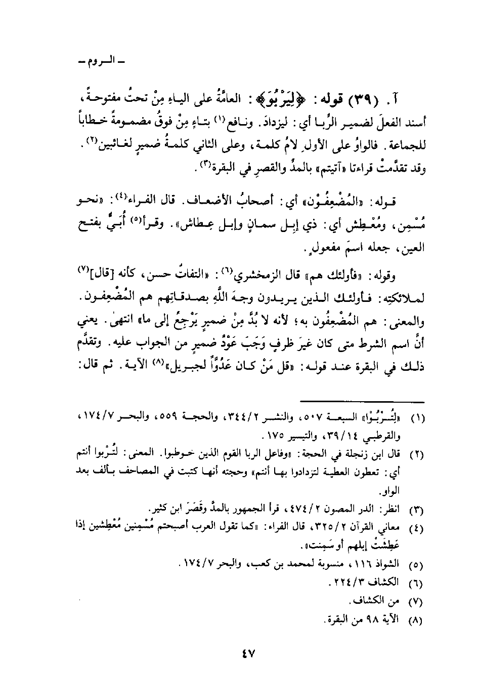 قوله: {لِّيَرْبُوَ} : العامَّةُ على الياءِ مِنْ تحتُ مفتوحةً، أسند الفعلَ لضمير الرِّبا أي: ليزدادَ. ونافع بتاءٍ مِنْ فوقُ مضمومةً خطاباً للجماعة. فالواوُ على الأولِ لامُ كلمة، وعلى الثاني كلمةُ ضميرٍ لغائبين. وقد تقدَّمتْ قراءتا «آتيتم» بالمدِّ والقصرِ في البقرة.