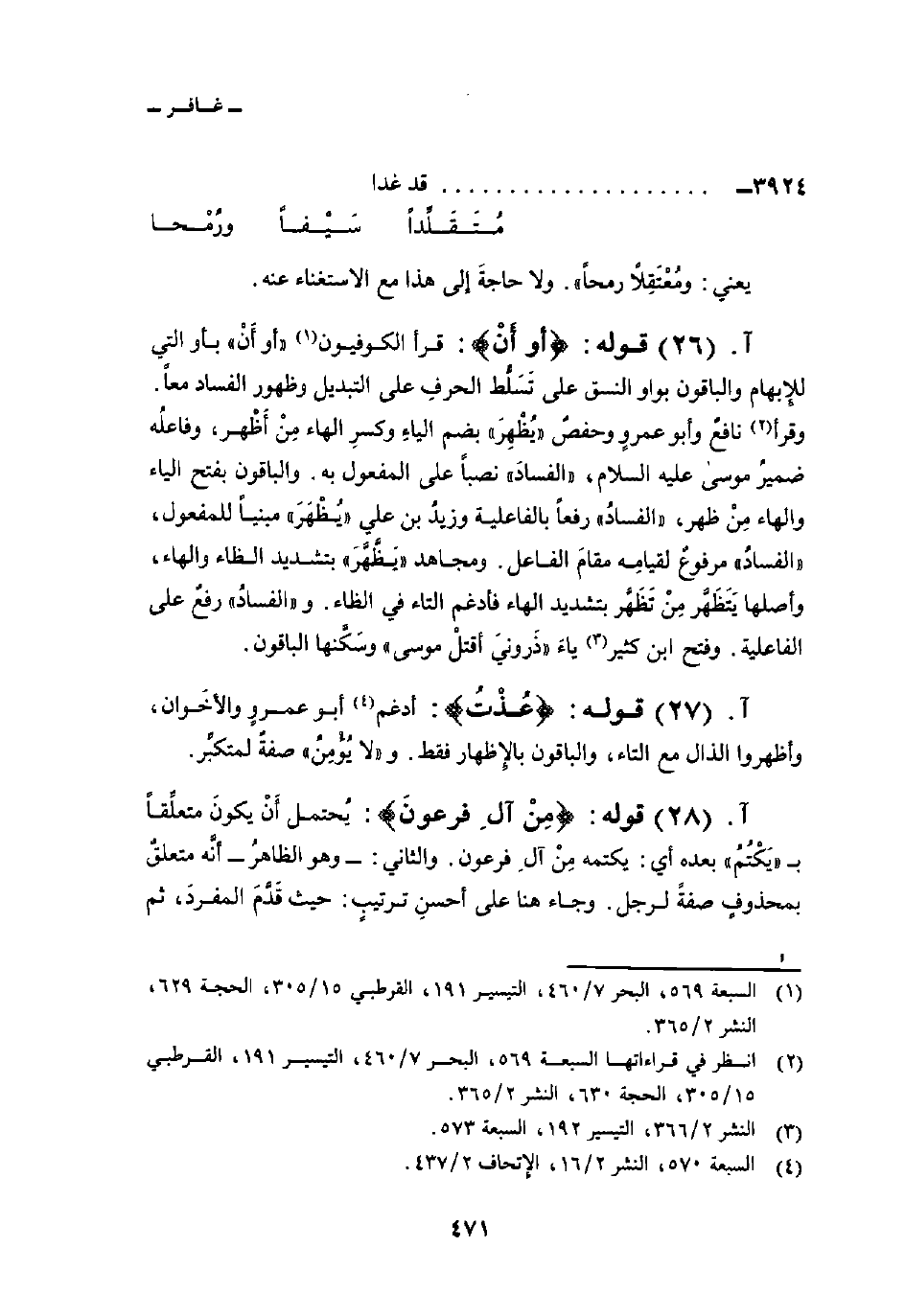 قوله: {أَوْ أَن} : قرأ الكوفيون «أو أَنْ» بأو التي للإِبهام والباقون بواو النسق على تَسَلُّط الحرفِ على التبديل وظهور الفساد معاً. وقرأ نافعٌ وأبو عمروٍ وحفصٌ «يُظْهِرَ» بضم الياءِ وكسرِ الهاء مِنْ أَظْهر، وفاعلُه ضميرُ موسى عليه السلام، «الفسادَ» نصباً على المفعول به. والباقون بفتح الياء والهاء مِنْ ظهر، «الفسادُ» رفعاً بالفاعلية وزيدُ بن علي «يُظْهَرَ» مبنياً للمفعول، «الفسادُ» مرفوعٌ لقيامِه مقامَ الفاعل. ومجاهد «يَظَّهَّرَ» بتشديد الظاء والهاء، وأصلها يَتَظَهَّر مِنْ تَظَهَّر بتشديد الهاء فأدغم التاء في الظاء. و «الفسادُ» رفعٌ على الفاعلية. وفتح ابن كثير ياءَ {ذروني أَقْتُلْ موسى} وسَكَّنها الباقون.