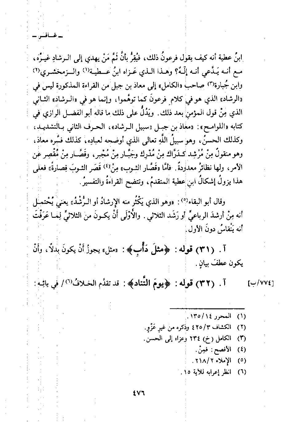 ابنُ عطية أنه كيف يقول فرعونُ ذلك، فيُقِرُّ بأنَّ ثَمَّ مَنْ يهدي إلى الرشادِ غيرُه، مع أنه يَدَّعي أنه إلهٌ؟ وهذا الذي عَزاه ابنُ عطية والزمخشري وابن جُبارة صاحب «الكامل» إلى معاذ بن جبل من القراءة المذكورة ليس في «الرشاد» الذي هو في كلامِ فرعونَ كما توهَّموا، وإنما هو في «الرشاد» الثاني الذي مِنْ قول المؤمنِ بعد ذلك. ويَدُلُّ على ذلك ما قاله أبو الفضل الرازي في كتابه «اللوامح» : «معاذ بن جبل» سبيل الرشاد «، الحرف الثاني بالتشديد، وكذلك الحسنُ، وهو سبيلُ اللَّهِ تعالى الذي أوضحه لعبادِه، كذلك فسَّره معاذ، وهو منقولٌ مِنْ مُرْشِد كدَرَّاك مِنْ مُدْرِك وجَبَّار مِنْ مُجْبر، وقَصَّار مِنْ مُقْصِر عن الأمر، ولها نظائرُ معدودةٌ. فأمَّا» قَصَّار الثوب «مِنْ قَصَر الثوبَ قِصارةً» فعلى هذا يزولُ إشكالُ ابنِ عطية المتقدمُ، وتتضح القراءةُ والتفسيرُ.