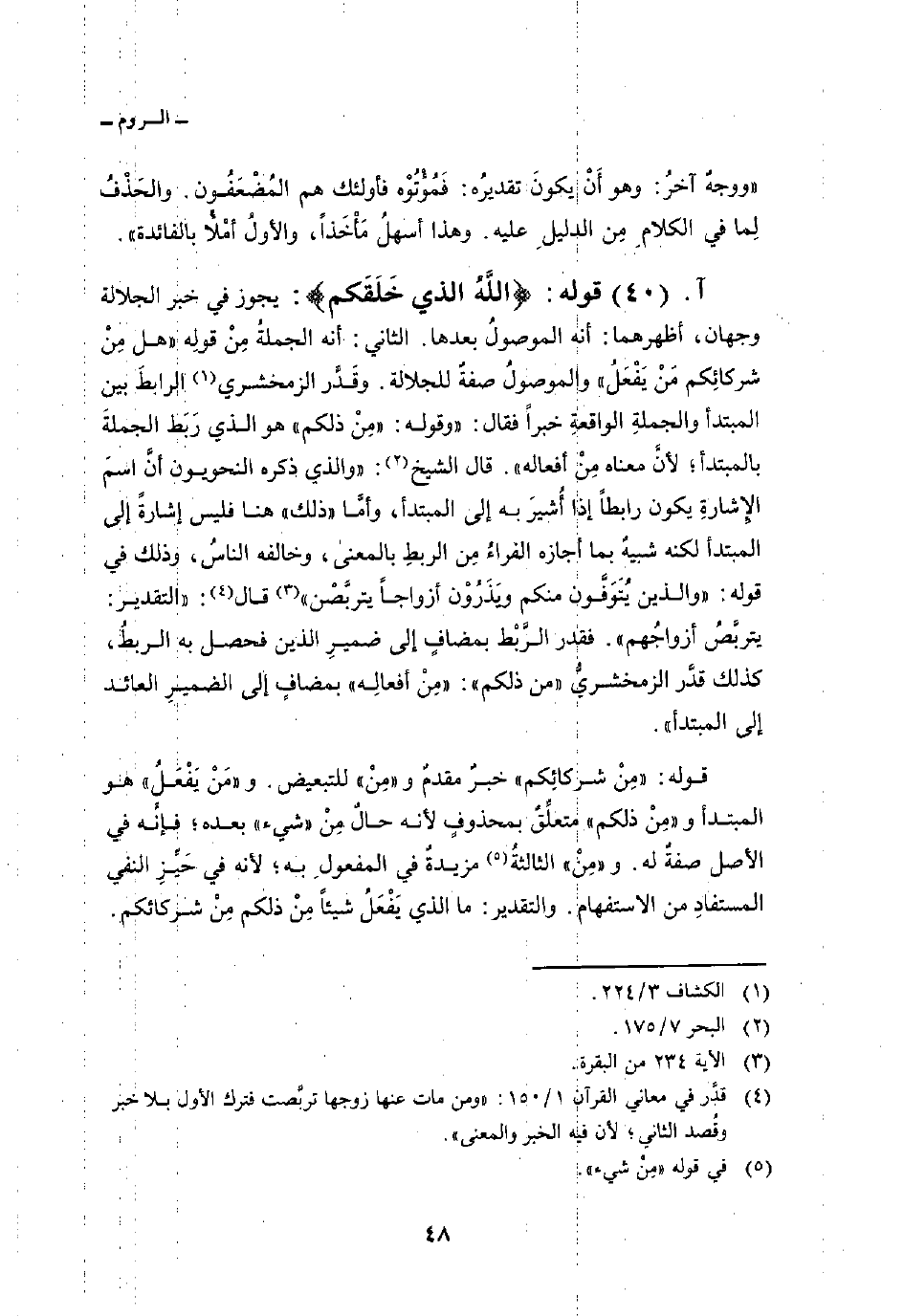 قوله: {الله الذي خَلَقَكُمْ} : يجوز في خبر الجلالة وجهان، أظهرهما: أنه الموصولُ بعدها. الثاني: أنه الجملةُ مِنْ قولِه {هَلْ مِن شُرَكَآئِكُمْ مَّن يَفْعَلُ} والموصولُ صفةٌ للجلالة. وقَدَّر الزمخشري الرابطَ بين المبتدأ والجملةِ الواقعةِ خبراً فقال: «وقوله:» مِنْ ذلكم «هو الذي رَبَط الجملةَ بالمبتدأ؛ لأنَّ معناه مِنْ أفعاله» . قال الشيخ: «والذي ذكره النحويون أنَّ اسمَ الإِشارةِ يكون رابطاً إذا أُشيرَ به إلى المبتدأ، وأمَّا» ذلك «هنا فليس إشارةً إلى المبتدأ لكنه شبيهٌ بما أجازه الفراءُ مِن الربطِ بالمعنى، وخالفه الناسُ، وذلك في قوله: {والذين يُتَوَفَّوْنَ مِنكُمْ وَيَذَرُونَ أَزْوَاجاً يَتَرَبَّصْنَ} [البقرة: 234] قال:» التقدير: يتربَّصُ أزواجُهم «. فقدر الرَّبْط بمضافٍ إلى ضميرِ الذين فحصل به الربطُ، كذلك قدَّر الزمخشريُّ» من ذلكم «:» مِنْ أفعالِه «بمضافٍ إلى الضميرِ العائد إلى المبتدأ» .