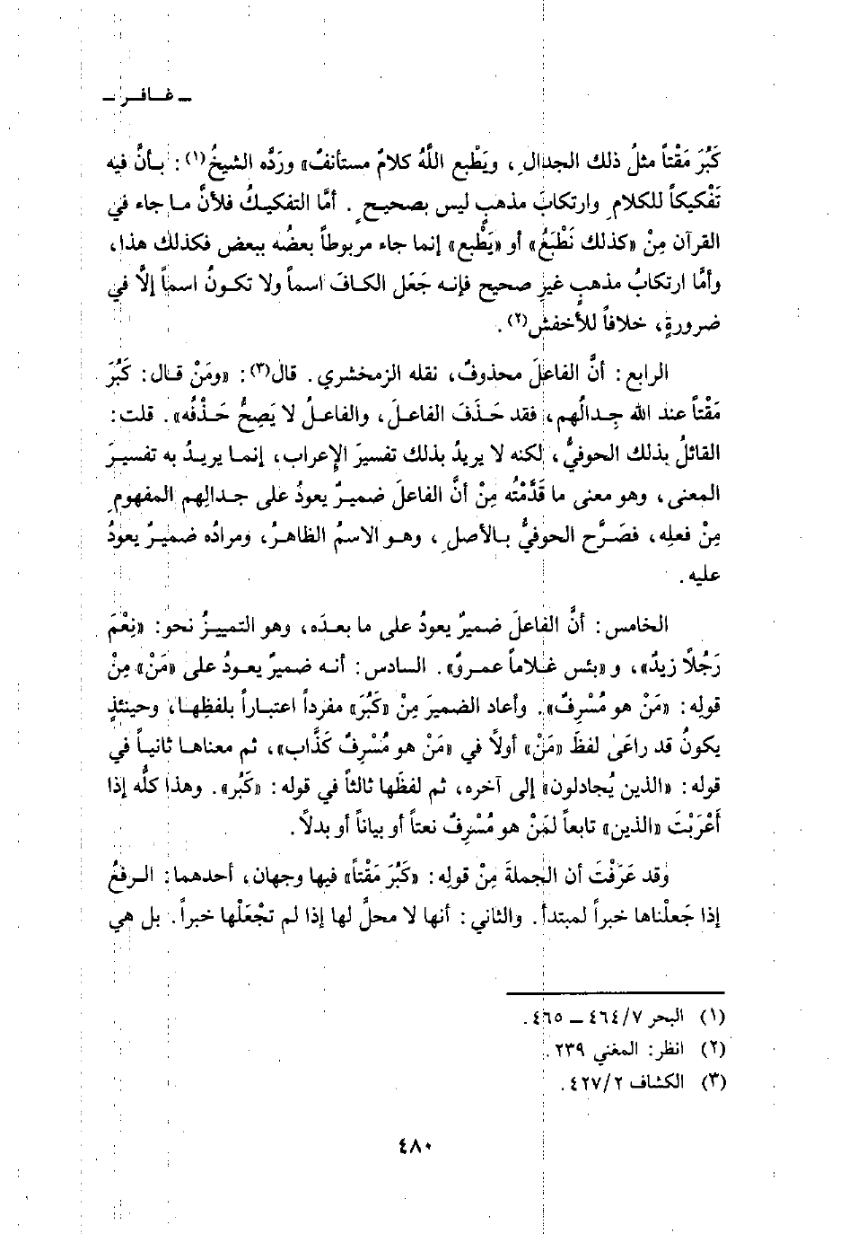 الرابع: أنَّ الفاعلَ محذوفٌ، نقله الزمخشري. قال: «ومَنْ قال: كَبُرَ مَقْتاً عند الله جِدالُهم، فقد حَذَفَ الفاعلَ، والفاعلُ لا يصِحُّ حَذْفُه» . قلت: القائلُ بذلك الحوفيُّ، لكنه لا يريدُ بذلك تفسيرَ الإِعراب، إنما يريدُ به تفسيرَ المعنى، وهو معنى ما قَدَّمْتُه مِنْ أنَّ الفاعلَ ضميرٌ يعودُ على جدالِهم المفهومِ مِنْ فعلِه، فصَرَّح الحوفيُّ بالأصلِ، وهو الاسمُ الظاهرُ، ومرادُه ضميرٌ يعودُ عليه.