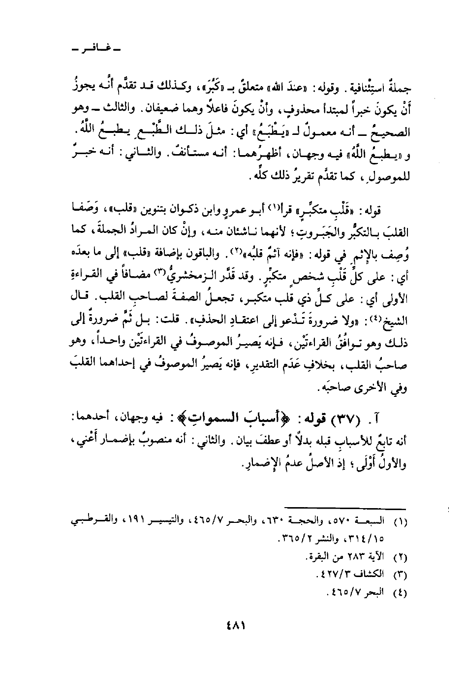 قوله: «قَلْبِ متكبِّرٍ» قرأ أبو عمروٍ وابن ذكوان بتنوين «قلب» ، وَصَفا القلبَ بالتكبُّر والجَبَروتِ؛ لأنهما ناشئان منه، وإنْ كان المرادُ الجملةَ، كما وُصِف بالإِثمِ في قوله: {فَإِنَّهُ آثِمٌ قَلْبُهُ} [البقرة: 283] . والباقون بإضافة «قلب» إلى ما بعدَه أي: على كلِّ قَلْبِ شخصٍ متكبِّرٍ. وقد قَدَّرَ الزمخشريُّ مضافاً في القراءةِ الأولى أي: على كلِّ ذي قلب متكبر، تجعلُ الصفةَ لصاحبِ القلب. قال الشيخ: «ولا ضرورةَ تَدْعو إلى اعتقادِ الحذفِ» . قلت: بل ثَمَّ ضرورةٌ إلى ذلك وهو توافُقُ القراءَتَيْن، فإنه يَصيرُ الموصوفُ في القراءتَيْن واحداً، وهو صاحبُ القلب، بخلافِ عَدَم التقديرِ، فإنه يَصيرُ الموصوفُ في إحداهما القلبَ وفي الأخرى صاحبَه.