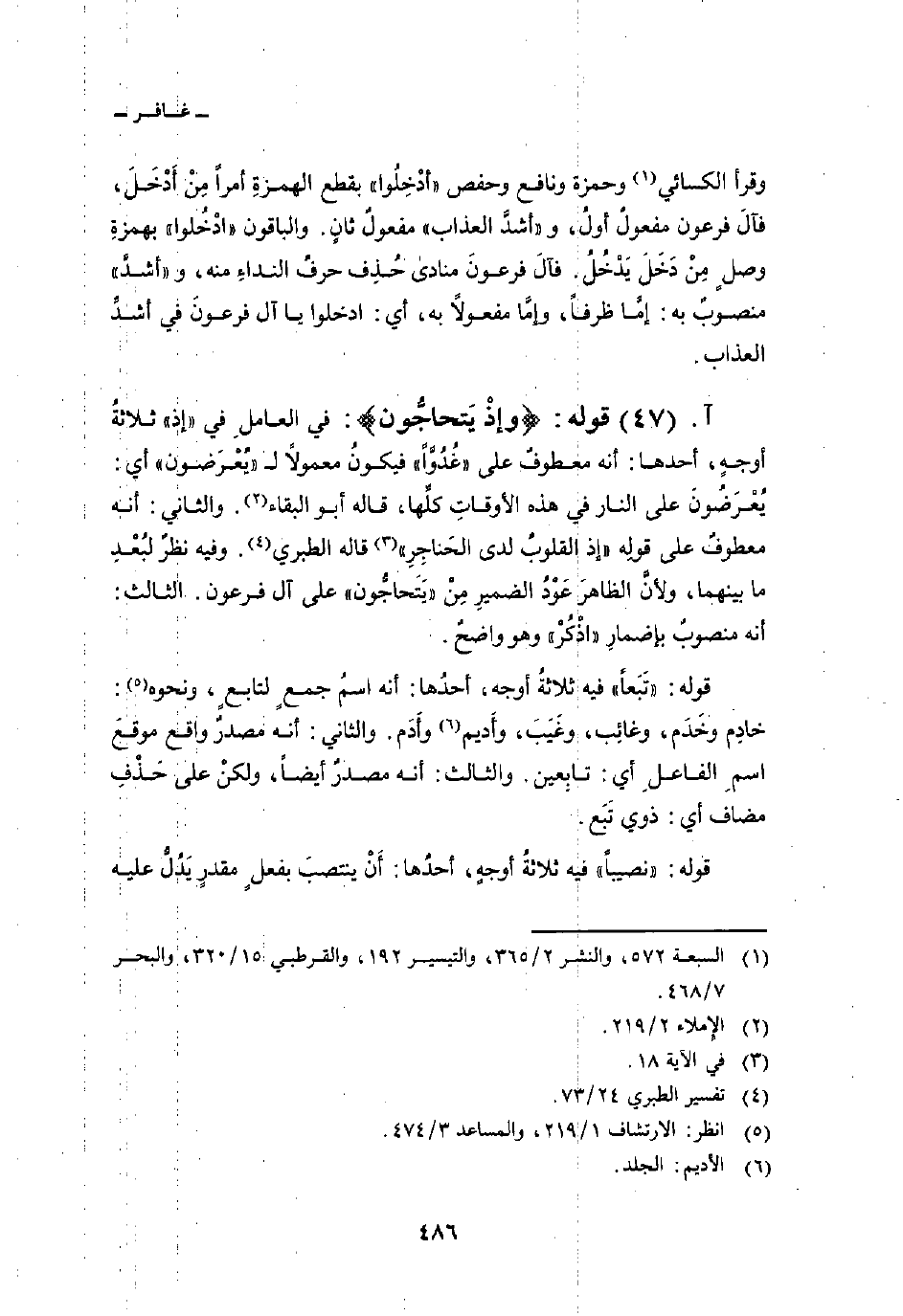 قوله: {وَإِذْ يَتَحَآجُّونَ} : في العاملِ في «إذ» ثلاثةُ أوجهٍ، أحدها: أنه معطوفٌ على «غُدُوَّاً» فيكونُ معمولاً ل «يُعْرَضون» أي: يُعْرَضُونَ على النار في هذه الأوقاتِ كلِّها، قاله أبو البقاء. والثاني: أنه معطوفٌ على قولِه {إِذِ القلوب لَدَى الحناجر} [غافر: 18] قاله الطبري. وفيه نظرٌ لبُعْدِ ما بينهما، ولأنَّ الظاهرَ عَوْدُ الضميرِ مِنْ «يَتَحاجُّون» على آل فرعون. الثالث: أنه منصوبٌ بإضمارِ «اذْكُرْ» وهو واضحٌ.