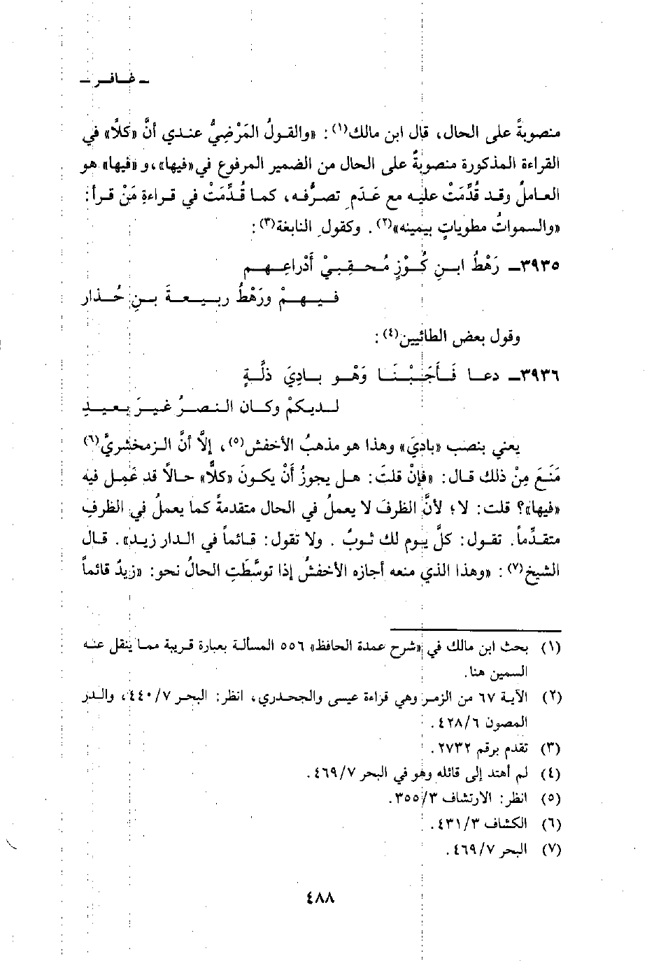 منصوبةً على الحال، قال ابن مالك: «والقولُ المَرْضِيُّ عندي أنَّ» كلاً «في القراءة المذكورة منصوبةٌ على الحال من الضمير المرفوع في» فيها «، و» فيها «هو العاملُ وقد قُدِّمَتْ عليه مع عَدَمِ تصرُّفه، كما قُدِّمَتْ في قراءةِ مَنْ قرأ: {والسماوات مَطْوِيَّاتٍ بِيَمِينِهِ} . وكقولِ النابغة: