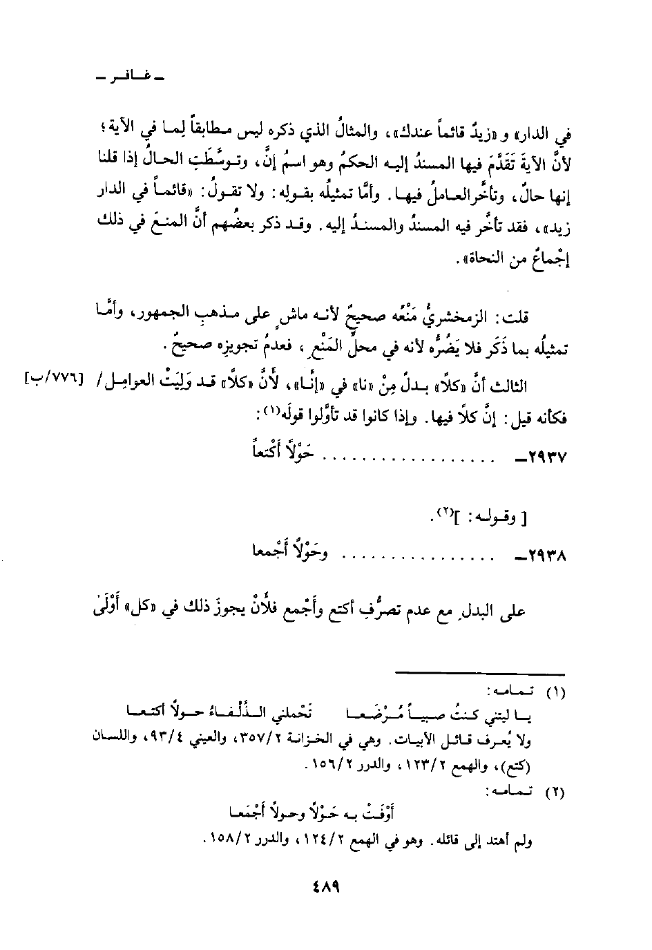 2938 -. . . . . . . . . . . . . . . . . . . . . . وحَوْلاً أَجْمعا ... على البدلِ مع عدم تصرُّفِ أكتع وأَجْمع فلأَنْ يجوزَ ذلك في «كل» أَوْلَى