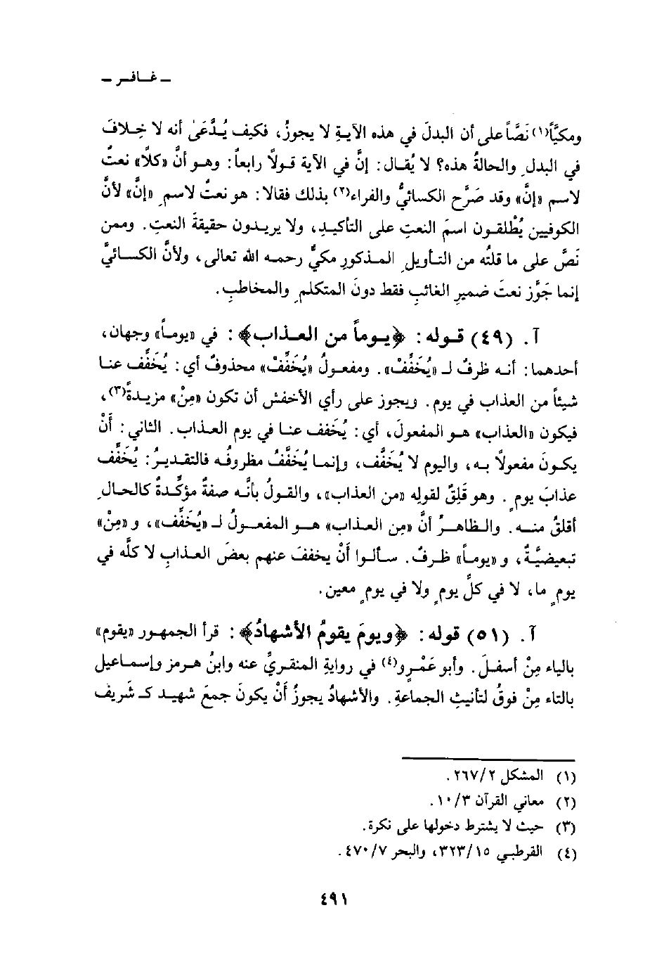 ومكيَّاً نَصَّاً على أن البدلَ في هذه الآيةِ لا يجوزُ، فكيف يُدَّعَى أنه لا خِلافَ في البدلِ والحالةُ هذه؟ لا يُقال: إنَّ في الآية قولاً رابعاً: وهو أنَّ «كلاً» نعتٌ لاسم «إنَّ» وقد صَرَّح الكسائيُّ والفراء بذلك فقالا: هو نعتٌ لاسمِ «إنَّ» لأنَّ الكوفيين يُطْلقون اسمَ النعتِ على التأكيدِ، ولا يريدون حقيقةَ النعتِ. وممن نَصَّ على ما قلتُه من التأويلِ المذكورِ مكيٌّ رحمه الله تعالى، ولأنَّ الكسائيَّ إنما جَوَّز نعتَ ضميرِ الغائبِ فقط دونَ المتكلمِ والمخاطبِ.