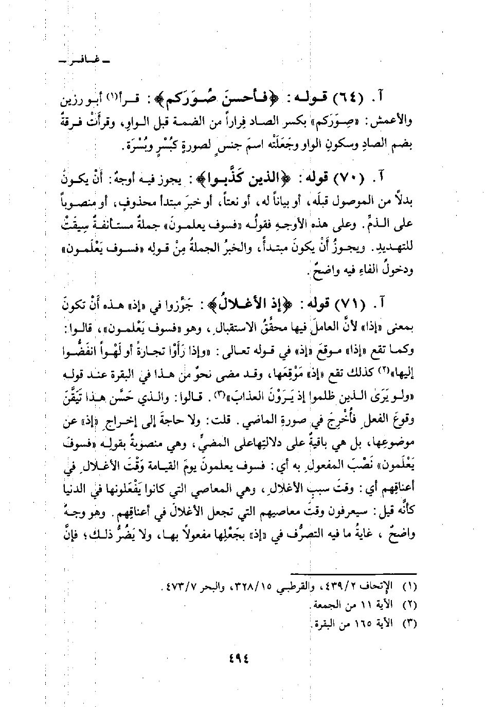 قوله: {إِذِ الأغلال} : جَوَّزوا في «إذ» هذه أَنْ تكونَ بمعنى «إذا» لأنَّ العاملَ فيها محقَّقُ الاستقبالِ، وهو «فسوف يَعْلمون» ، قالوا: وكما تقع «إذا» موقعَ «إذ» في قوله تعالى: {وَإِذَا رَأَوْاْ تِجَارَةً أَوْ لَهْواً انفضوا إِلَيْهَا} [الجمعة: 11] كذلك تقع «إذ» مَوْقِعَها، وقد مضى نحوٌ من هذا في البقرة عند قوله {وَلَوْ يَرَى الذين ظلموا إِذْ يَرَوْنَ العذاب} [البقرة: 165] . قالوا: والذي حَسَّن هذا تَيَقَّنَ وقوعَ الفعلِ فأُخْرِجَ في صورةِ الماضي. قلت: ولا حاجةَ إلى إخراجِ «إذ» عن موضوعِها، بل هي باقيةٌ على دلالتِها على المضيِّ، وهي منصوبةٌ بقولِه «فسوفَ يَعْلَمون» نَصْبَ المفعولِ به أي: فسوف يعلمونَ يومَ القيامة وَقْتَ الأغلالِ في أعناقِهم أي: وقتَ سببِ الأغلالِ، وهي المعاصي التي كانوا يَفْعَلونها في الدنيا كأنَّه قيل: سيعرفون وقتَ معاصيهم التي تجعل الأَغلالَ في أعناقِهم. وهو وجهٌ واضحٌ، غايةُ ما فيه التصرُّف في «إذ» بجَعْلِها مفعولاً بها، ولا يَضُرُّ ذلك؛ فإنَّ