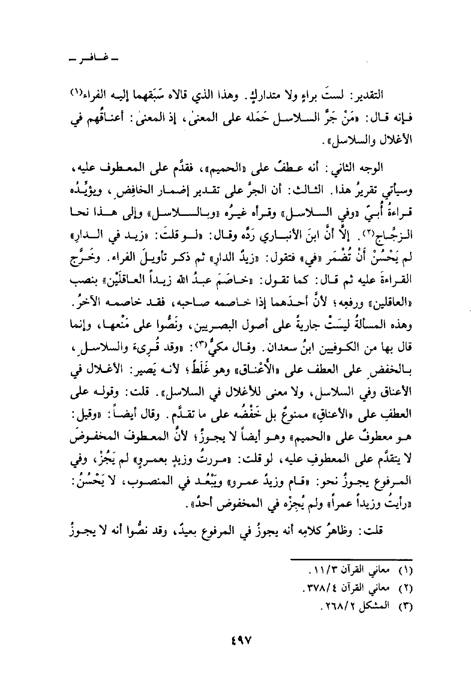 الوجه الثاني: أنه عطفٌ على» الحميم «، فقدَّم على المعطوف عليه، وسيأتي تقريرُ هذا. الثالث: أن الجرَّ على تقدير إضمار الخافِضِ، ويؤيِّدُه قراءةُ أُبيّ» وفي السلاسل «وقرأه غيرُه» وبالسلاسل «وإلى هذا نحا الزجَّاج. إلاَّ أنَّ ابنَ الأنباري رَدَّه وقال:» لو قلتَ: «زيد في الدارِ» لم يَحْسُنْ أَنْ تُضْمَر «في» فتقول: «زيدٌ الدارِ» ثم ذكر تأويلَ الفراء. وخَرَّج القراءةَ عليه ثم قال: كما تقول: «خاصَمَ عبدُ الله زيداً العاقلَيْن» بنصب «العاقلين» ورفعِه؛ لأنَّ أحدَهما إذا خاصمه صاحبه، فقد خاصمه الآخرُ. وهذه المسألةُ ليسَتْ جاريةً على أصول البصريين، ونَصُّوا على مَنْعها، وإنما قال بها من الكوفيين ابنُ سعدان. وقال مكيٌّ: «وقد قُرِئَ والسلاسلِ، بالخفضِ على العطف على» الأَعْناق «وهو غَلَط؛ لأنه يَصير: الأغلال في الأعناق وفي السلاسل، ولا معنى للأغلال في السلاسل» . قلت: وقوله على العطفِ على «الأعناقِ» ممنوعٌ بل خَفْضُه على ما تقدَّم. وقال أيضاً: «وقيل: هو معطوفٌ على» الحميم «وهو أيضاً لا يجوزُ؛ لأنَّ المعطوفَ المخفوضَ لا يتقدَّم على المعطوفِ عليه، لو قلت:» مررتُ وزيدٍ بعمروٍ «لم يَجُزْ، وفي المرفوع يجوزُ نحو:» قام وزيدٌ عمرو «ويَبْعُد في المنصوب، لا يَحْسُنُ:» رأيتُ وزيداً عمراً «ولم يُجِزْه في المخفوض أحدٌ» .