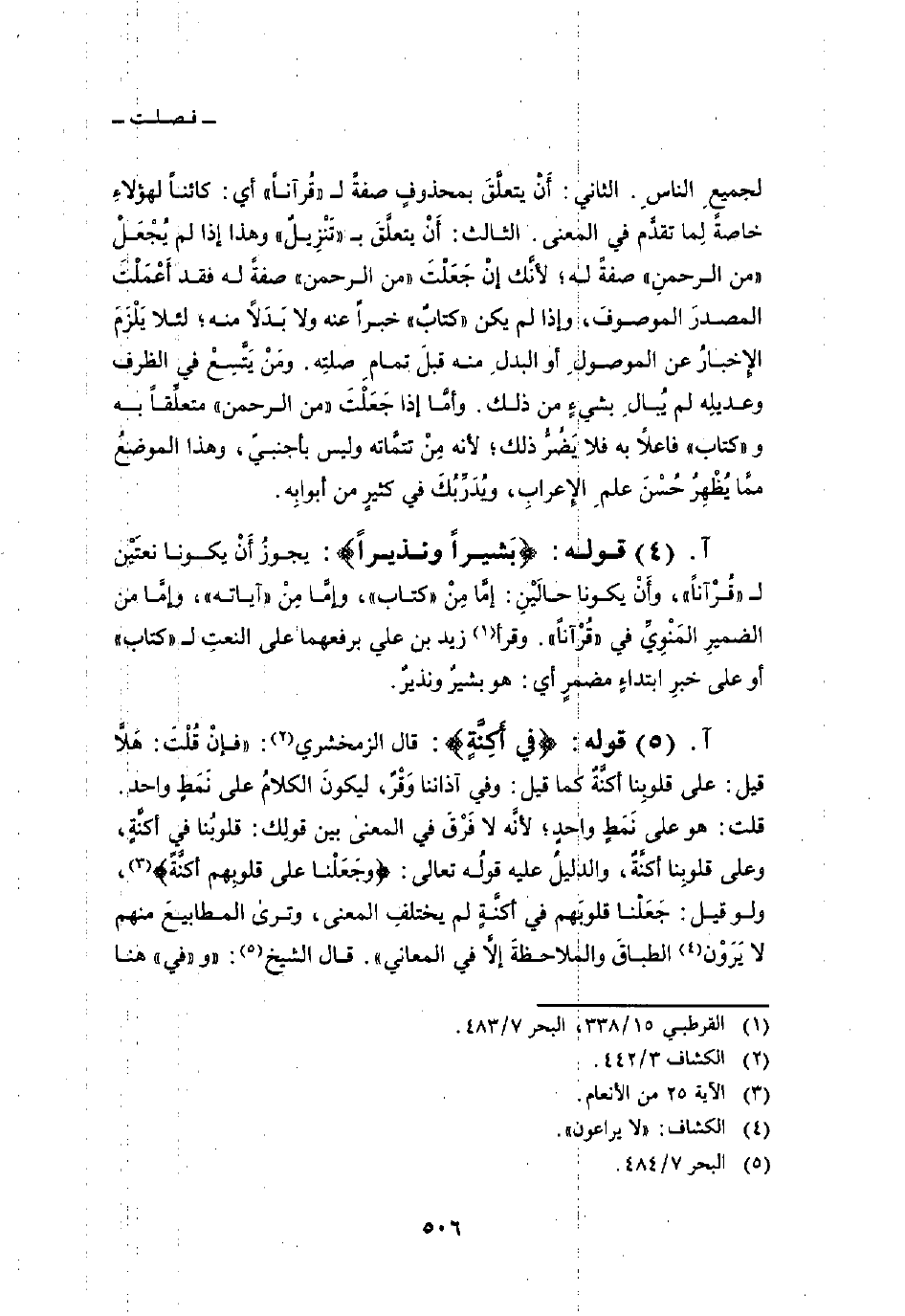 قوله: {بَشِيراً وَنَذِيراً} : يجوزُ أَنْ يكونا نعتَيْن ل «قُرْآناً» ، وأَنْ يكونا حالَيْنِ: إمَّا مِنْ «كتاب» ، وإمَّا مِنْ «آياته» ، وإمَّا من الضميرِ المَنْوِيِّ في «قُرْآناً» . وقرأ زيد بن علي برفعهما على النعتِ ل «كتاب» أو على خبرِ ابتداءٍ مضمرٍ أي: هو بشيرٌ ونذيرٌ.