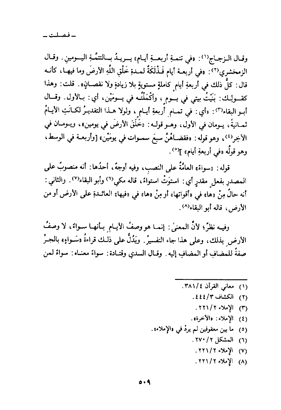 وقال الزجاج: «في تتمةِ أربعةِ أيام» يريدُ بالتتمَّةِ اليومينِ. وقال الزمخشري: «في أربعة أيام فَذْلَكَةٌ لمدةِ خَلْقِ اللَّهِ الأرضَ وما فيها، كأنه قال: كلُّ ذلك في أربعةِ أيامٍ كاملةٍ مستويةٍ بلا زيادةٍ ولا نقصانٍ» . قلت: وهذا كقولِك: بَنَيْتُ بيتي في يومٍ، وأكْمَلْتُه في يومَيْن. أي: بالأول. وقال أبو البقاء: «أي: في تمامِ أربعةِ أيامٍ، ولولا هذا التقديرُ لكانَتِ الأيامُ ثمانيةً، يومان في الأول، وهو قوله: {خَلَقَ الأرض فِي يَوْمَيْنِ} ، ويومان في الآخِر، وهو قوله: {فَقَضَاهُنَّ سَبْعَ سَمَاوَاتٍ فِي يَوْمَيْنِ} [وأربعة في الوسط، وهو قولُه {في أَرْبَعَةِ أَيَّامٍ} ] .