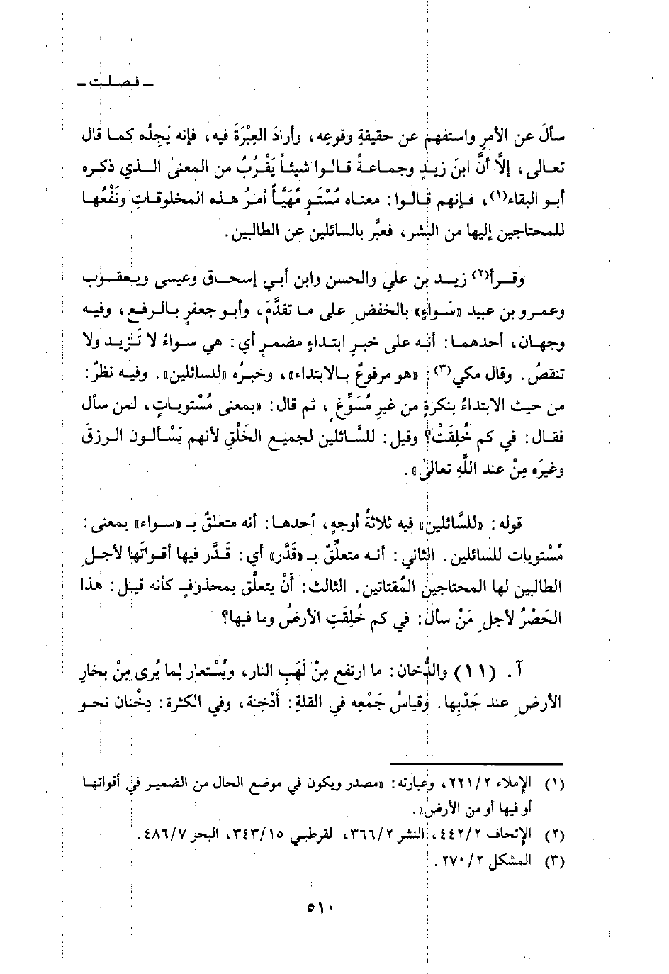 قوله:» للسَّائلين «فيه ثلاثةُ أوجهٍ، أحدها: أنه متعلقٌ ب» سواء «بمعنى: مُسْتويات للسائلين. الثاني: أنه متعلِّقٌ ب» قَدَّر «أي: قَدَّر فيها أقواتَها لأجلِ الطالبين لها المحتاجين المُقتاتين. الثالث: أَنْ يتعلَّق بمحذوفٍ كأنه قيل: هذا الحَصْرُ لأجلِ مَنْ سأل: في كم خُلِقَتِ الأرضُ وما فيها؟