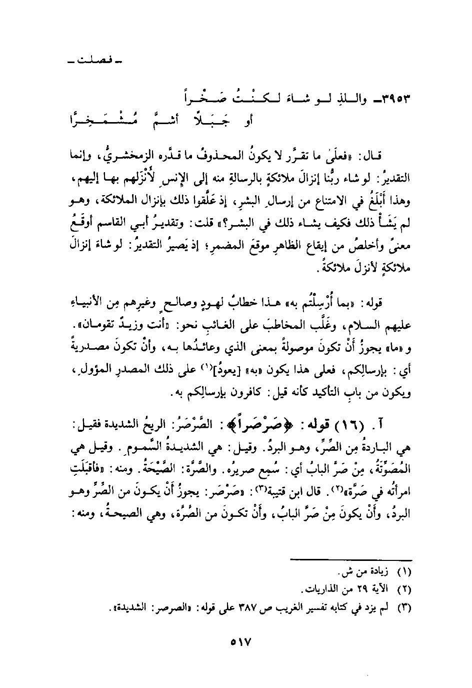 قوله: {صَرْصَراً} : الصَّرْصَرُ: الريحُ الشديدة فقيل: هي الباردةُ مِن الصِّرِّ، وهو البردُ. وقيل: هي الشديدةُ السَّمومِ. وقيل هي المُصَوِّتَةُ، مِنْ صَرَّ البابُ أي: سُمِع صريرُه. والصَّرَّة: الصَّيْحَةُ. ومنه: {فَأَقْبَلَتِ امرأته فِي صَرَّةٍ} [الذاريات: 29] . قال ابن قتيبة: «صَرْصَر: يجوزُ أَنْ يكونَ من الصِّرِّ وهو البردُ، وأَنْ يكونَ مِنْ صَرَّ البابُ، وأَنْ تكونَ من الصَّرَّة، وهي الصيحةُ، ومنه: {