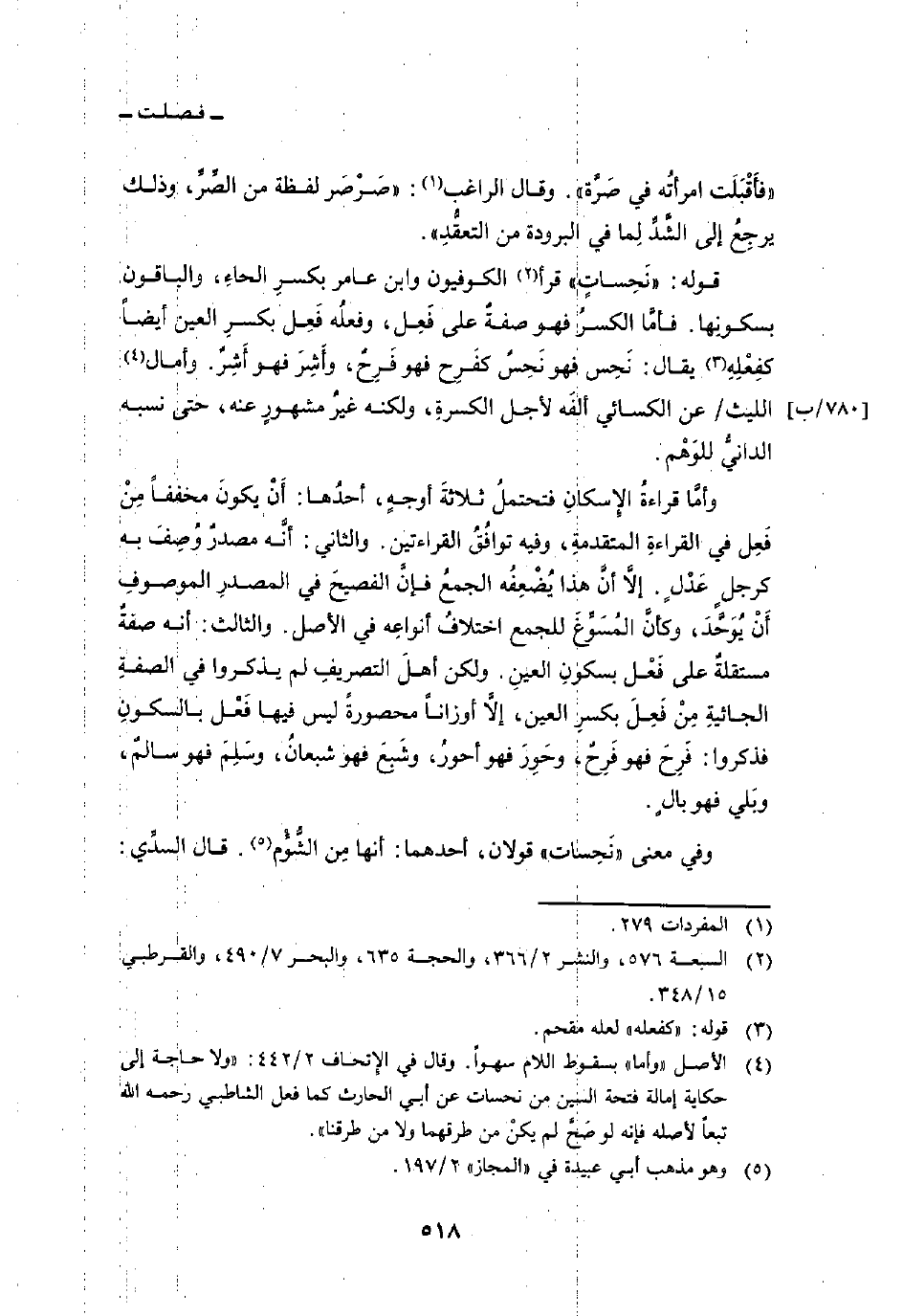 قوله:» نَحِساتٍ «قرأ الكوفيون وابن عامر بكسرِ الحاءِ، والباقون بسكونِها. فأمَّا الكسرُ فهو صفةٌ على فَعِل، وفعلُه فَعِل بكسرِ العين أيضاً كفِعْلِهِ يقال: نَحِس فهو نَحِسٌ كفَرِح فهو فَرِحٌ، وأَشِرَ فهو أَشِرٌ. وأمال الليث/ عن الكسائي ألفَه لأجل الكسرةِ، ولكنه غيرُ مشهورٍ عنه، حتى نسبه الدانيُّ للوَهْم.