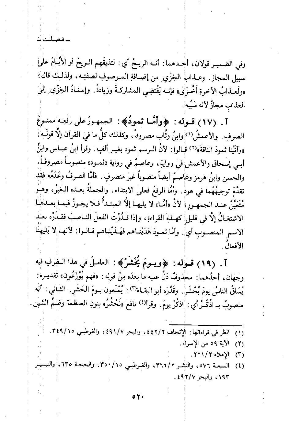 قوله: {وَأَمَّا ثَمُودُ} : الجمهورُ على رَفْعِه ممنوعَ الصرفِ. والأعمشُ وابنُ وثَّاب مصروفاً، وكذلك كلُّ ما في القرآن إلاَّ قولَه: {وَآتَيْنَا ثَمُودَ الناقة} [الإسراء: 59] قالوا: لأنَّ الرسم ثمود بغير ألفٍ. وقرأ ابنُ عباس وابنُ أبي إسحاق والأعمش في روايةٍ، وعاصمٌ في رواية «ثمود» منصوباً مصروفاً. والحسن وابنُ هرمز وعاصمٌ أيضاً منصوباً غيرَ منصرفٍ. فأمَّا الصرفُ وعَدَمُه فقد تقدَّمَ توجيهُهُما في هود. وأمَّا الرفعُ فعلى الابتداء، والجملةُ بعده الخبرُ، وهو مُتَعَيّنٌ عند الجمهورِ؛ لأنَّ «أمَّا» لا يليها إلاَّ المبتدأُ فلا يجوزُ فيما بعدها الاشتغالُ إلاَّ في قليلٍ كهذه القراءةِ، وإذا قَدَّرْتَ الفعلَ الناصبَ فقدِّرْه بعد الاسمِ المنصوبِ أي: وأمَّا ثمودَ هَدَيْناهم فهَدَيْناهم قالوا: لأنها لا يَليها الأفعالُ.