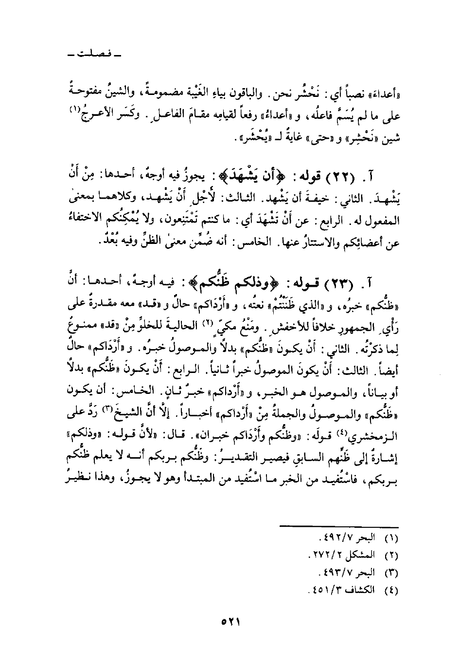 قوله: {أَن يَشْهَدَ} : يجوزُ فيه أوجهٌ، أحدها: مِنْ أَنْ يَشْهدَ. الثاني: خيفةَ أن يَشْهد. الثالث: لأَجْلِ أَنْ يَشْهد، وكلاهما بمعنى المفعول له. الرابع: عن أَنْ تَشْهَدَ أي: ما كنتم تَمْتَنِعون، ولا يُمْكِنُكم الاختفاءُ عن أعضائِكم والاستتارُ عنها. الخامس: أنه ضُمِّن معنى الظنِّ وفيه بُعْدٌ.