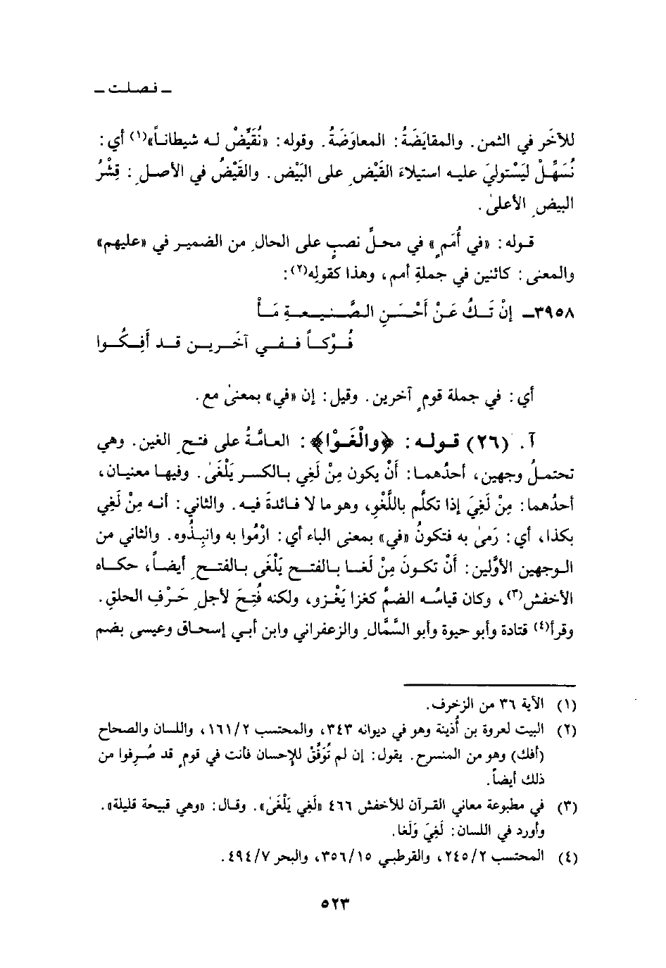 قوله: {والغوا} : العامَّةُ على فتحِ الغين. وهي تحتملُ وجهين، أحدُهما: أَنْ يكون مِنْ لَغِي بالكسر يَلْغَى. وفيها معنيان، أحدُهما: مِنْ لَغِيَ إذا تكلَّم باللَّغْوِ، وهو ما لا فائدةَ فيه. والثاني: أنه مِنْ لَغِي بكذا، أي: رَمى به فتكونُ «في» بمعنى الباء أي: ارْمُوا به وانبِذُوه. والثاني من الوجهين الأوَّلين: أَنْ تكونَ مِنْ لَغا بالفتح يَلْغَى بالفتحِ أيضاً، حكاه الأخفش، وكان قياسُه الضمَّ كغزا يَغْزو، ولكنه فُتِح لأجلِ حَرْفِ الحلقِ. وقرأ قتادة وأبو حيوة وأبو السَّمَّالِ والزعفراني وابن أبي إسحاق وعيسى بضم