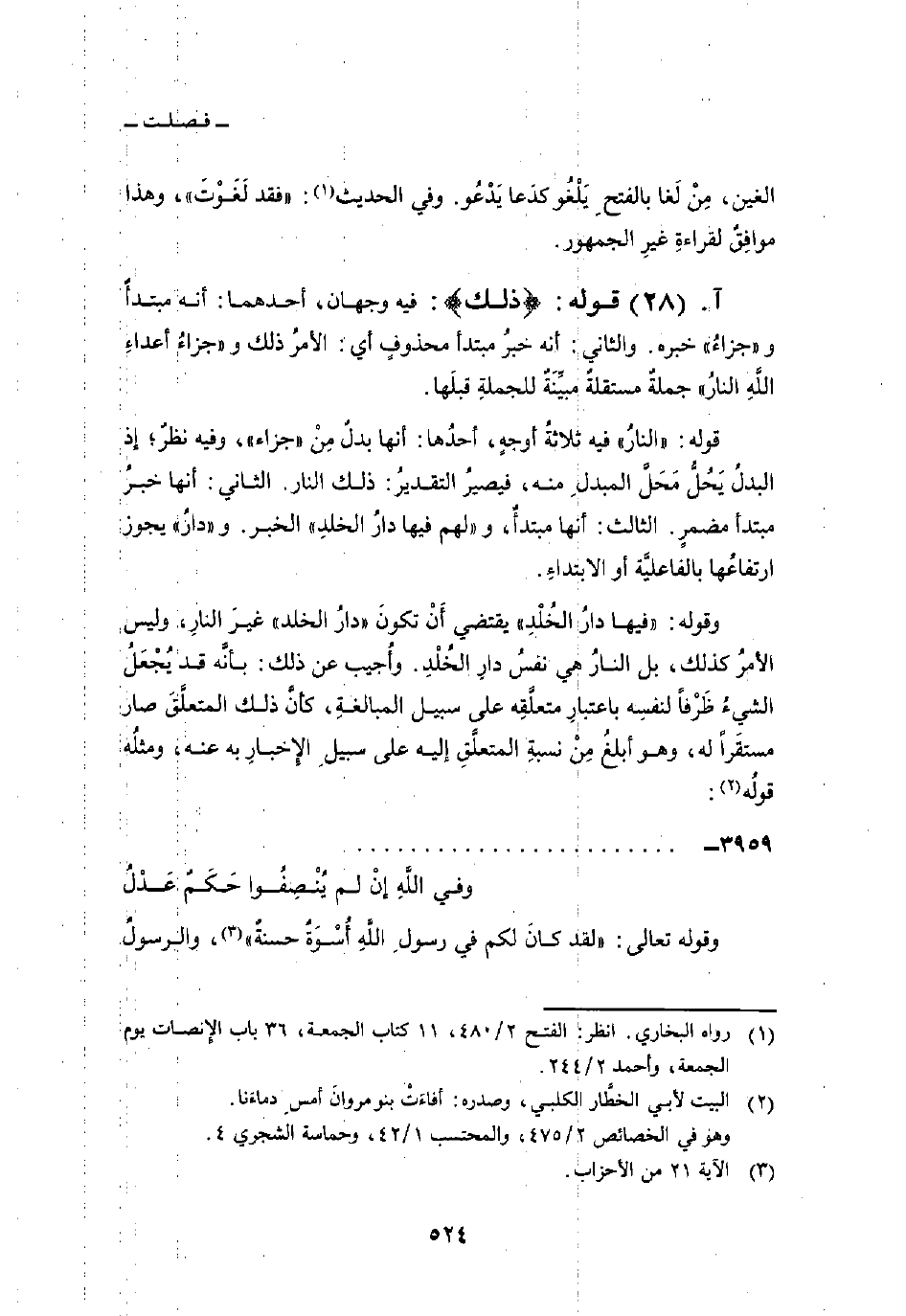 قوله: {ذَلِكَ} : فيه وجهان، أحدهما: أنه مبتدأٌ و «جزاءُ» خبره. والثاني: أنه خبرُ مبتدأ محذوفٍ أي: الأمرُ ذلك و {جَزَآءُ أَعْدَآءِ الله النار} جملةٌ مستقلةٌ مبيِّنَةٌ للجملةِ قبلَها.