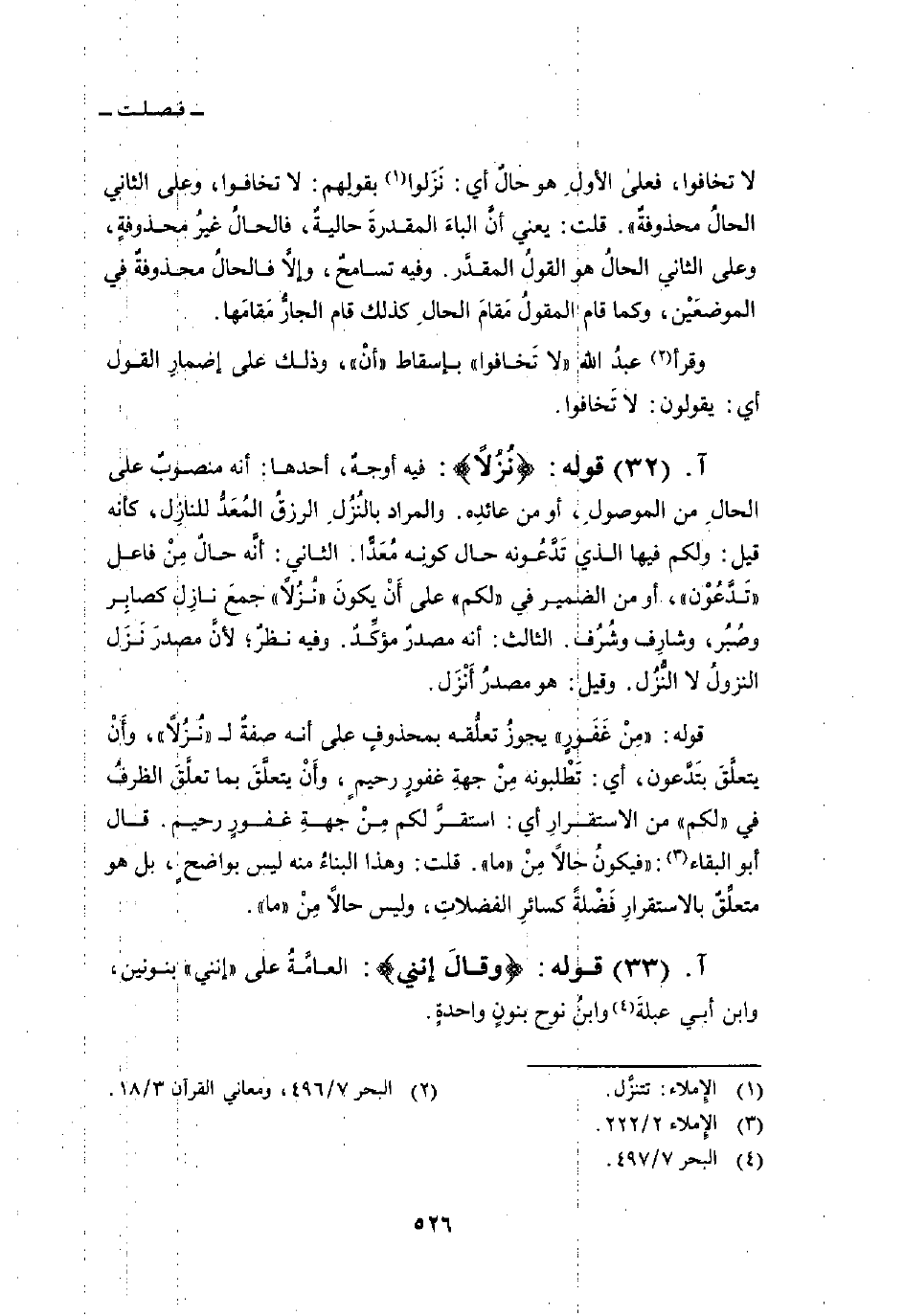 قوله: {نُزُلاً} : فيه أوجهٌ، أحدها: أنه منصوبٌ على الحالِ من الموصولِ، أو من عائدِه. والمراد بالنُزُلِ الرزقُ المُعَدُّ للنازِل، كأنه قيل: ولكم فيها الذي تَدَّعُونه حال كونِه مُعَدًّا. الثاني: أنَّه حالٌ مِنْ فاعل «تَدَّعُوْن» ، أو من الضمير في «لكم» على أَنْ يكونَ «نُزُلاً» جمعَ نازِل كصابِر وصُبُر، وشارِف وشُرُف. الثالث: أنه مصدرٌ مؤكِّدٌ. وفيه نظرٌ؛ لأنَّ مصدرَ نَزَل النزولُ لا النُّزُل. وقيل: هو مصدرُ أَنْزَل.