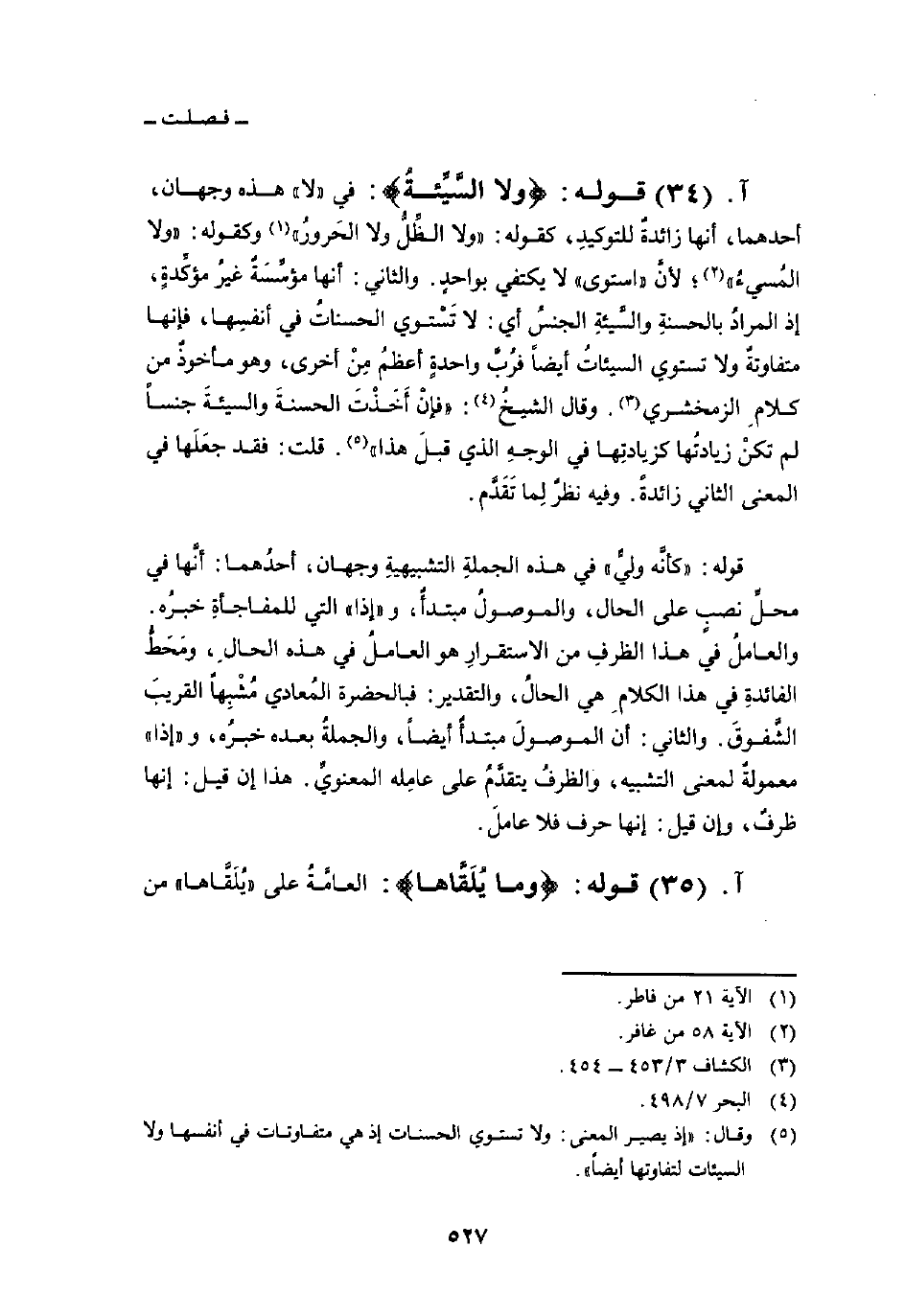 قوله: {وَلاَ السيئة} : في «لا» هذه وجهان، أحدهما، أنها زائدةٌ للتوكيدِ، كقوله: {وَلاَ الظل وَلاَ الحرور} [فاطر: 21] وكقوله: {وَلاَ المسياء} [غافر: 58] ؛ لأنَّ «استوى» لا يكتفي بواحدٍ. والثاني: أنها مؤسِّسَةٌ غيرُ مؤكِّدةٍ، إذ المرادُ بالحسنةِ والسَّيئةِ الجنسُ أي: لا تَسْتوي الحسناتُ في أنفسِها، فإنها متفاوتةٌ ولا تستوي السيئاتُ أيضاً فرُبَّ واحدةٍ أعظمُ مِنْ أخرى، وهو مأخوذٌ من كلامِ الزمخشري. وقال الشيخُ: «فإنْ أَخَذْتَ الحسنةَ والسيئةَ جنساً لم تكنْ زيادتُها كزيادتِها في الوجهِ الذي قبلَ هذا» . قلت: فقد جَعَلها في المعنى الثاني زائدةً. وفيه نظرٌ لِما تَقَدَّم.
