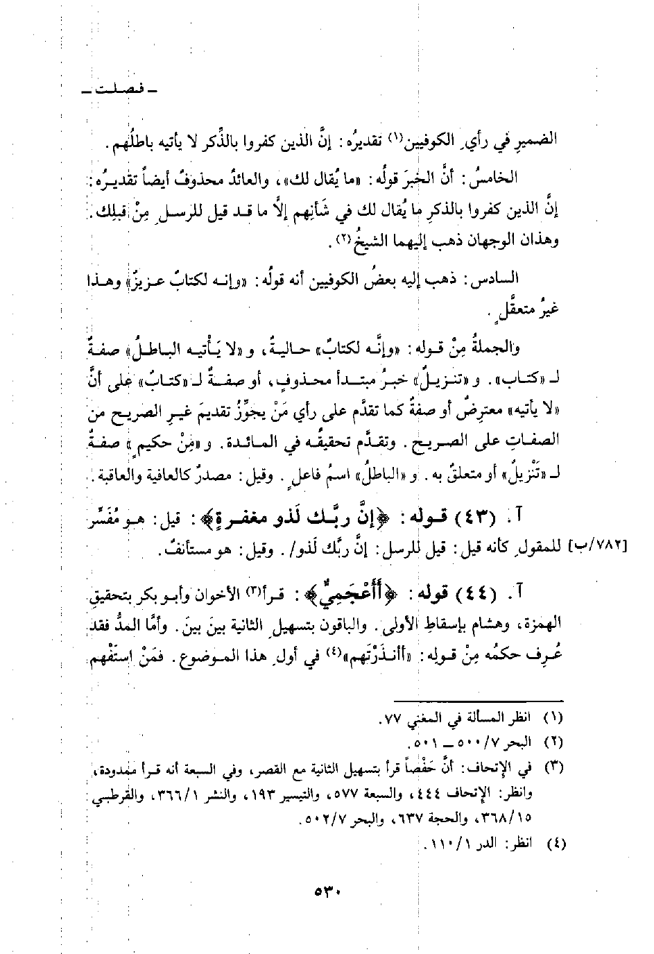 قوله: {ءَاعْجَمِيٌّ} : قرأ الأخوان وأبو بكر بتحقيقِ الهمزة، وهشام بإسقاطِ الأولى. والباقون بتسهيلِ الثانية بينَ بينَ. وأمَّا المدُّ فقد عُرِف حكمُه مِنْ قولِه: «أأنذَرْتَهم» في أولِ هذا الموضوع. فمَنْ استفَهْم