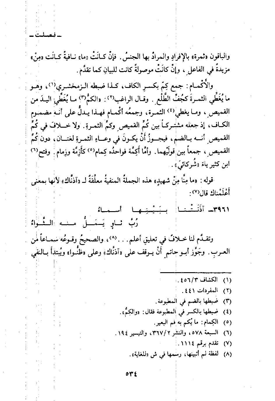 والأَكْمام: جمع كِمّ بكسرِ الكاف، كذا ضبطه الزمخشري، وهو ما يُغَطِّي الثمرةَ كجُفِّ الطَّلْعِ. وقال الراغب: «الكمُّ ما يُغَطِّي اليدَ من القميصِ، وما يغطي الثمرة، وجمعُه أكْمام فهذا يدلُّ على أنه مضموم الكاف، إذ جعله مشتركاً بين كُمِّ القيمصِ وكمِّ الثمرةِ. ولا خلافَ في كُمِّ القميصِ أنه بالضم، فيجوزُ أَنْ يكونَ في وعاءِ الثمرةِ لغتان، دون كُمِّ القميصِ، جمعاً بين قولَيْهما. وأمَّا أَكِمَّة فواحدُه كِمام كأَزِمَّة وزِمام. وفتح ابن كثير ياءَ» شُركائيَ «.