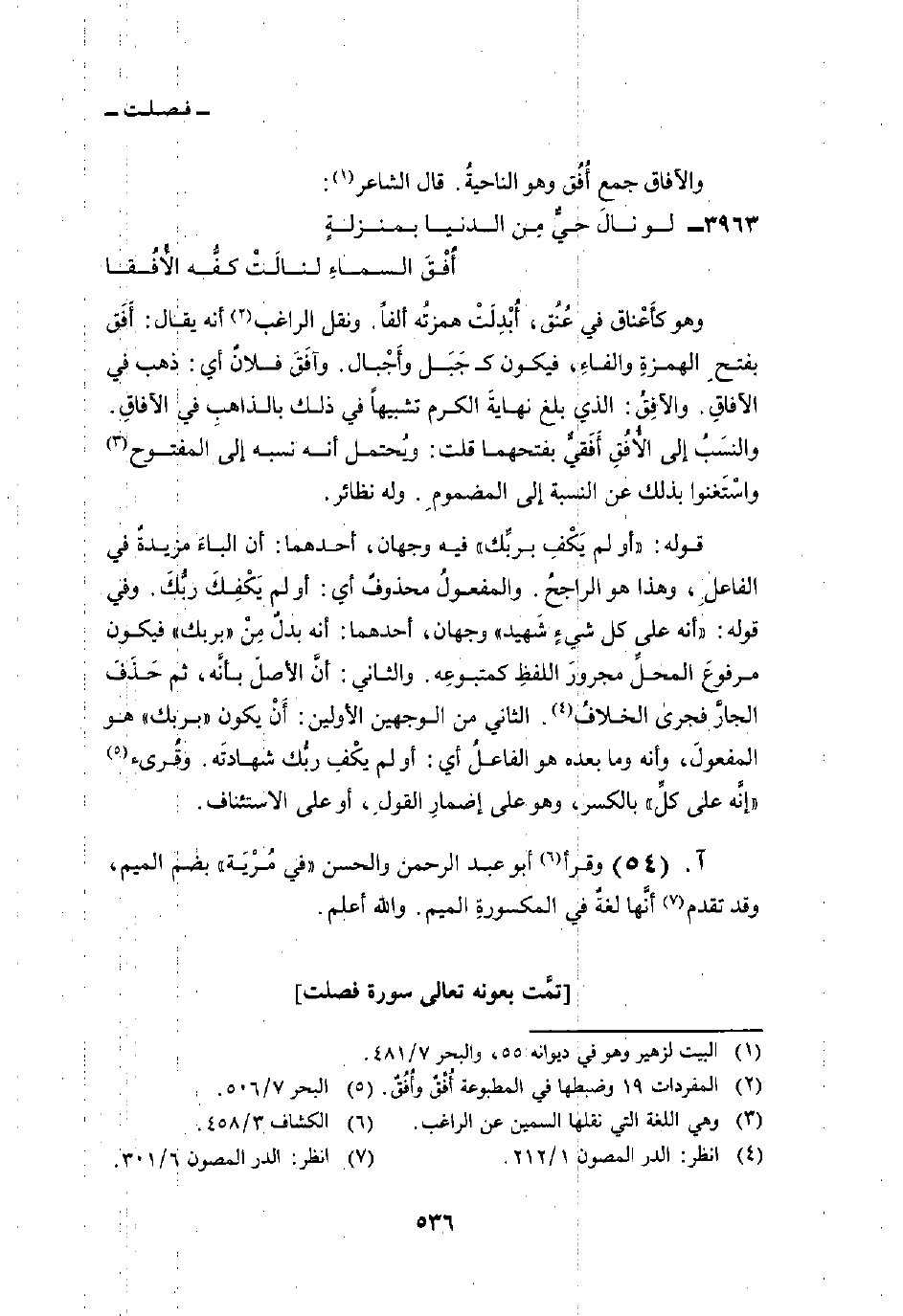 قوله: {أَوَلَمْ يَكْفِ بِرَبِّكَ} فيه وجهان، أحدهما: أن الباءَ مزيدةٌ في الفاعلِ، وهذا هو الراجحُ. والمفعولُ محذوفٌ أي: أو لم يَكْفِكَ ربُّكَ. وفي قوله: {أَنَّهُ على كُلِّ شَيْءٍ شَهِيدٌ} وجهان، أحدهما: أنه بدلٌ مِنْ «بربك» فيكون مرفوعَ المحلِّ مجرورَ اللفظِ كمتبوعِه. والثاني: أنَّ الأصلَ بأنَّه، ثم حَذَفَ الجارَّ فجرى الخلافُ. الثاني من الوجهين الأولين: أَنْ يكون «بربك» هو المفعولَ، وأنه وما بعده هو الفاعلُ أي: أو لم يكْفِ ربُّك شهادتَه. وقُرئ {أَنَّهُ على كُلِّ} بالكسر، وهو على إضمارِ القولِ، أو على الاستئناف.