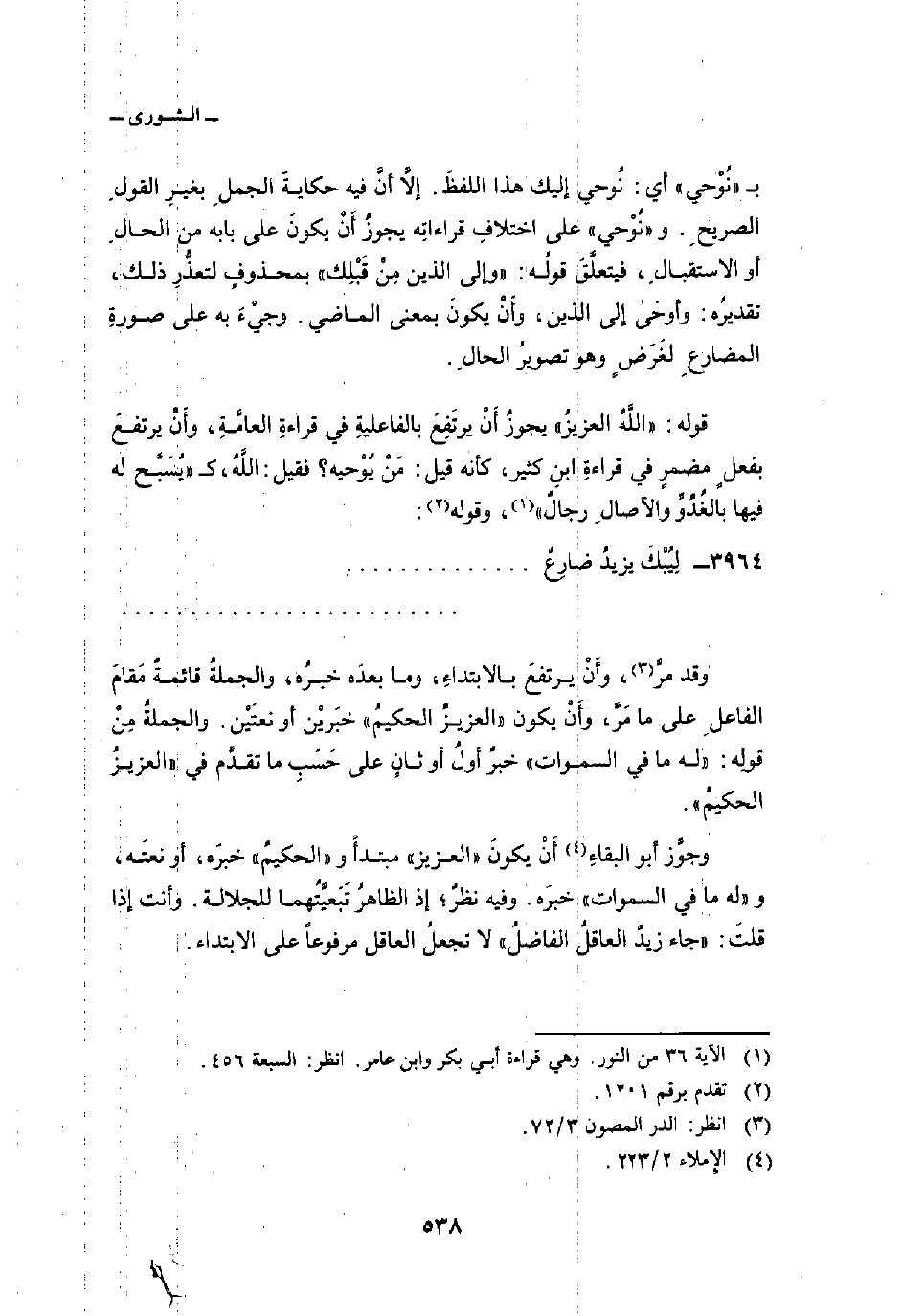 قوله: «اللَّهُ العزيزُ» يجوزُ أَنْ يرتَفِعَ بالفاعليةِ في قراءةِ العامَّةِ، وأَنْ يرتفعَ بفعلٍ مضمرٍ في قراءةِ ابنِ كثير، كأنه قيل: مَنْ يُوْحيه؟ فقيل: اللَّه، ك {يُسَبِّحُ لَهُ فِيهَا بالغدو والآصال} [النور: 36] ، وقوله: