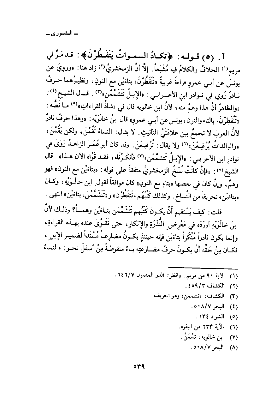 قوله: {تَكَادُ السماوات يَتَفَطَّرْنَ} : قد مَرَّ في مريم الخلافُ والكلامُ فيه مُشْبَعاً. إلاَّ أنَّ الزمخشريَّ زاد هنا: «وروِيَ عن يونسَ عن أبي عمروٍ قراءةٌ غريبةٌ» تَتَفَطَّرْنَ «بتاءَيْن مع النونِ، ونظيرُهما حرفٌ نادرٌ رُوي في نوادر ابنِ الأعرابي:» الإِبلُ تَتَشَمَّمْن «. قال الشيخ:» والظاهرُ أنَّ هذا وهمٌ منه؛ لأنَّ ابن خالويه قال في «شاذِّ القراءاتِ» ما نَصُّه: «تَنْفَطِرْنَ» بالتاء والنون، يونس عن أبي عمروٍ «قال ابنُ خالَوَيْه:» وهذا حرفٌ نادرٌ لأنَّ العربَ لا تجمعُ بين علامَتَيْ التأنيثِ. لا يقال: النساءُ تَقُمْنَ، ولكن يَقُمْنَ، {والوالدات يُرْضِعْنَ} [البقرة: 233] ولا يقال: تُرْضَعْنَ. وقد كان أبو عُمَرَ الزاهدُ رَوَى في نوادرِ ابن الأعرابي: «الإِبلُ تَتشمَّمْن» فأنكَرْنَاه، فقد قَوَّاه الآن هذا «. قال الشيخ:» فإنْ كانَتْ نُسَخُ الزمخشريِّ متفقةً على قولِه: «بتاءَيْن مع النون» فهو وهمٌ، وإنْ كان في بعضها «بتاءٍ مع النونِ» كان موافقاً لقولِ ابن خالَوَيْهِ، وكان «بتاءَيْن» تحريفاً من النَّساخ. وكذلك كَتْبُهُم «تَتَفَطَّرْن» و «تَتَشَمَّمْنَ» بتاءَيْن «انتهى.