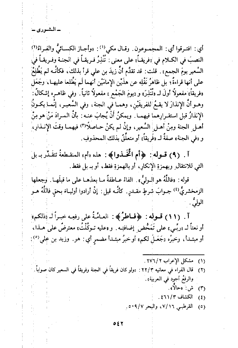 أي: افترقوا أي: المجموعون. وقال مكي: «وأجاز الكسائيُّ والفراءُ النصبَ في الكلام في» فريقاً «على معنى: تُنْذِرُ فريقاً في الجنة وفريقاً في السَّعير يومَ الجمع» . قلت: قد تقدَّم أنَّ زيدَ بن علي قرأ بذلك، فكأنَّه لم يَطَّلِعْ على أنها قراءةٌ؛ بل ظاهرُ نَقْلِه عن هذَيْن الإِمامَيْن أنهما لَم يَطَّلعا عليها، وجَعَل «فريقاً» مفعولاً أولَ ل «تُنْذِرَ» و «يومَ الجَمْعِ» مفعولاً ثانياً. وفي ظاهرِه إشكالٌ: وهو أنَّ الإِنذارَ لا يقعُ للفريقَيْنِ، وهما في الجنة، وفي السَّعير، إنَّما يكونُ الإِنذارُ قبل استقرارِهما فيهما. ويمكنُ أَنْ يُجابَ عنه: بأنَّ المرادَ مَنْ هو مِنْ أهلِ الجنة ومِنْ أهلِ السَّعير، وإنْ لم يكنْ حاصلاً فيهما وقتَ الإِنذارِ، و «في الجنة» صفةٌ ل «فَريقاً» أو متعلِّقٌ بذلك المحذوفِ.