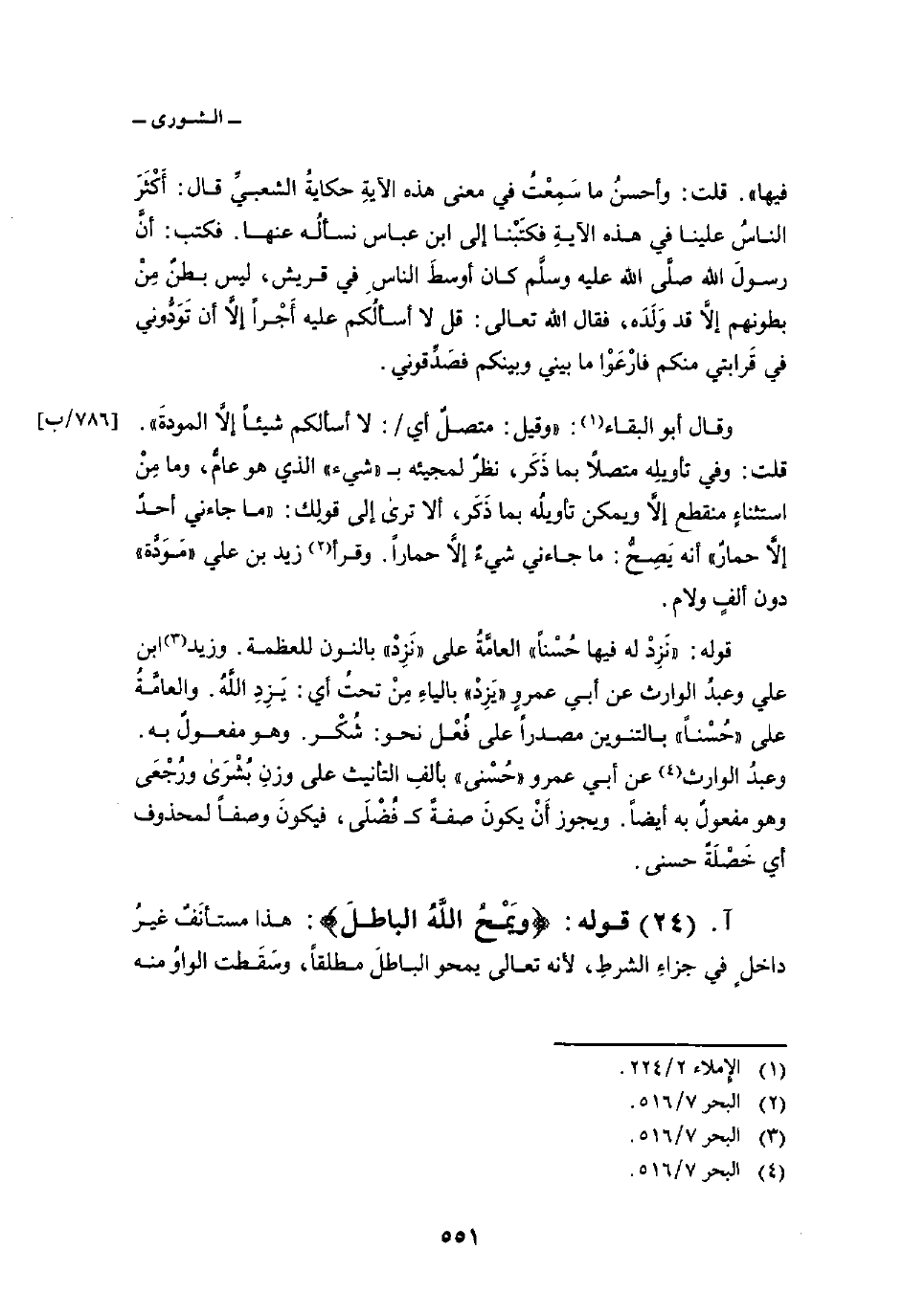 فيها» . قلت: وأحسنُ ما سَمِعْتُ في معنى هذه الآيةِ حكايةُ الشعبيِّ قال: أَكْثَرَ الناسُ علينا في هذه الآيةِ فكتَبْنا إلى ابن عباس نسألُه عنها. فكتب: أنَّ رسولَ الله صلَّى الله عليه وسلَّم كان أوسطَ الناسِ في قريش، ليس بطنٌ مِنْ بطونهم إلاَّ قد وَلَدَه، فقال الله تعالى: قل لا أسألُكم عليه أَجْراً إلاَّ أن تَوَدُّوني في قَرابتي منكم فارْعَوْا ما بيني وبينكم فصَدِّقوني.