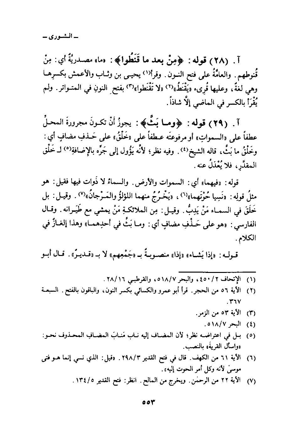 قوله: «فيهما» أي: السماوات والأرض. والسماءُ لا ذَوات فيها فقيل: هو مثلُ قولِه: {نَسِيَا حُوتَهُمَا} ، [الكهف: 61] {يَخْرُجُ مِنْهُمَا الُّلؤْلُؤُ وَالمَرْجَانُ} [الرحمن: 22] . وقيل: بل خَلَقَ في السماء مَنْ يَدِبُّ. وقيل: مِن الملائكةِ مَنْ يمشي مع طَيَرانه. وقال الفارسي: «هو على حَذْفِ مضافٍ أي: وما بَثَّ في أحدِهما» وهذا إلغازٌ في الكلام.
