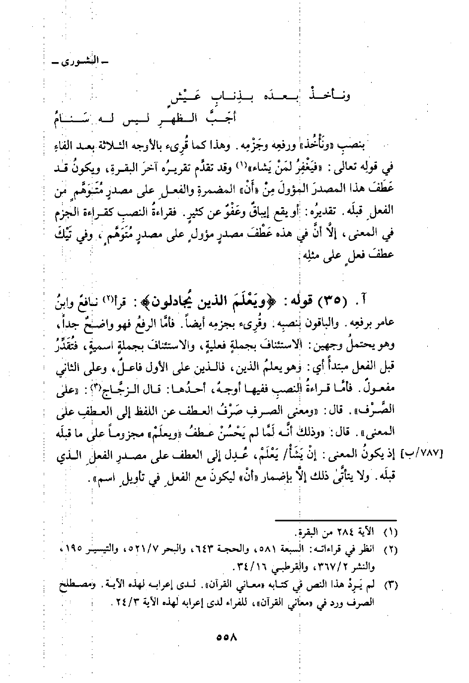 بنصبِ» ونَأْخُذ «ورفعِه وجَزْمِه. وهذا كما قُرِئ بالأوجه الثلاثة بعد الفاءِ في قولِه تعالى: {فَيَغْفِرُ لِمَن يَشَآءُ} [البقرة: 284] وقد تقدَّم تقريرُه آخرَ البقرةِ، ويكونُ قد عَطَفَ هذا المصدرَ المؤولَ مِنْ» أَنْ «المضمرةِ والفعلِ على مصدرٍ مُتَوَهَّمٍ من الفعلِ قبلَه. تقديرُه: أو يقع إيباقٌ وعَفْوٌ عن كثيرٍ. فقراءةُ النصبِ كقراءة الجزم في المعنى، إلاَّ أنَّ في هذه عَطْفَ مصدرٍ مؤولٍ على مصدرٍ مُتَوَهَّمٍ، وفي تَيْكَ عطفَ فعلٍ على مثلِه.