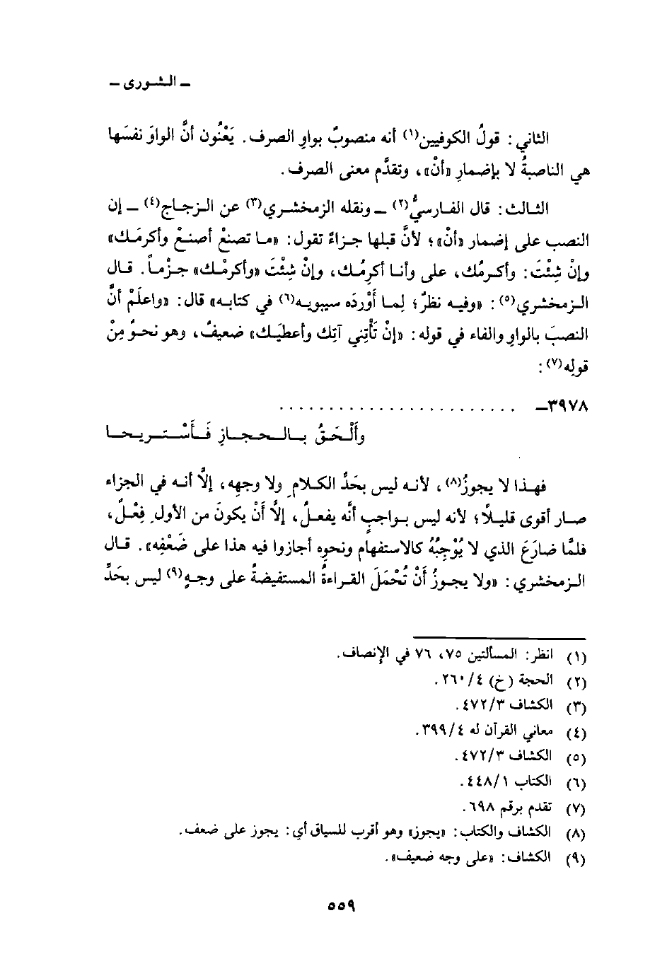 الثالث: قال الفارسيُّ - ونقله الزمخشري عن الزجاج - إن النصب على إضمار «أنْ» ؛ لأنَّ قبلها جزاءً تقول: «ما تصنعْ أصنعْ وأكرمَك» وإنْ شِئْتَ: وأكرمُك، على وأنا أكرِمُك، وإنْ شِئْتَ «وأكرمْك» جزْماً. قال الزمخشري: «وفيه نظرٌ؛ لِما أَوْردَه سيبويه في كتابه» قال: «واعلَمْ أنَّ النصبَ بالواوِ والفاء في قوله:» إنْ تَأْتِني آتِك وأعطيكَ «ضعيفٌ، وهو نحوٌ مِنْ قولِه:
