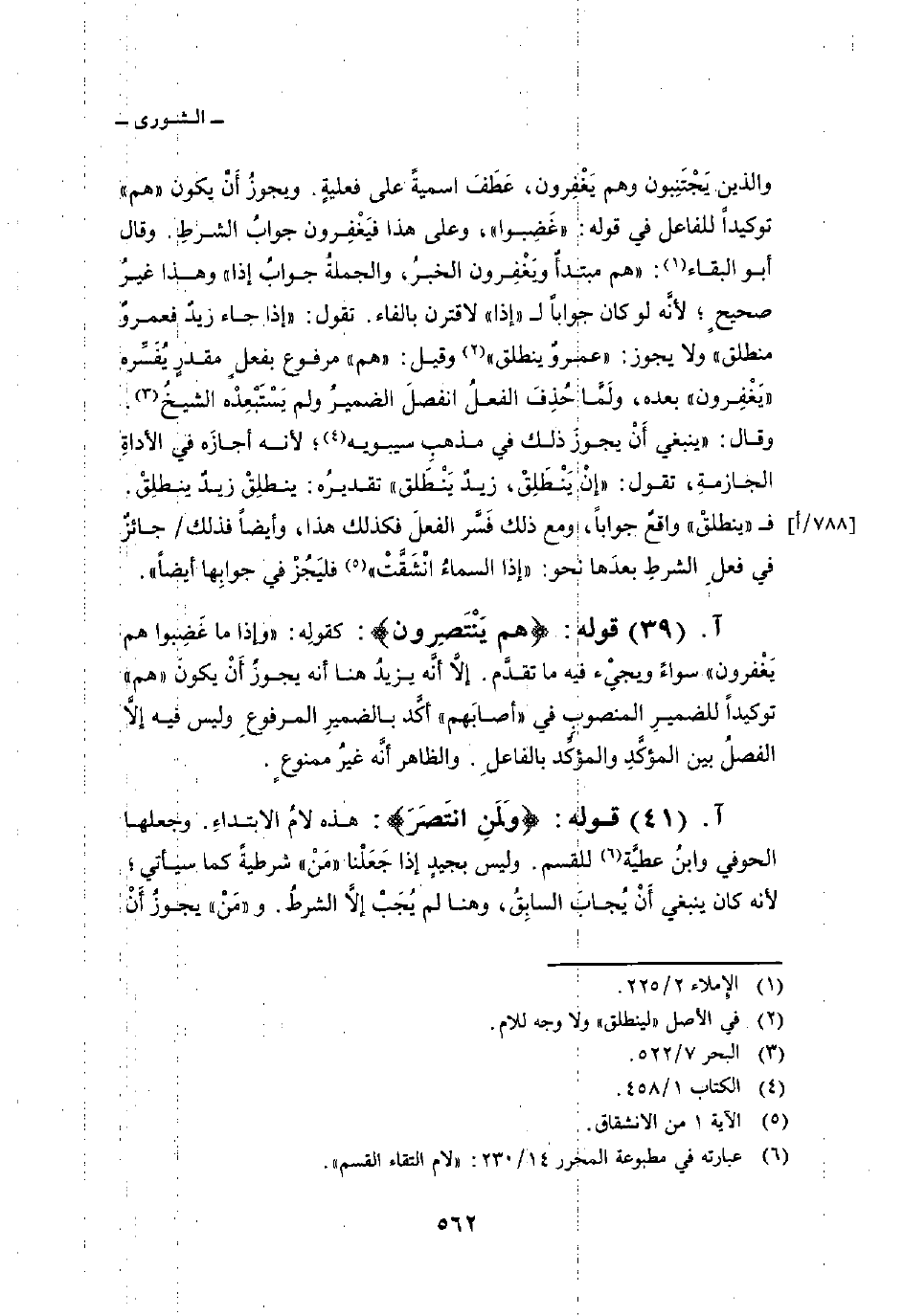 والذين يَجْتَنِبون وهم يَغْفِرون، عَطَفَ اسميةً على فعليةٍ. ويجوزُ أَنْ يكون «هم» توكيداً للفاعل في قوله: «غَضِبوا» ، وعلى هذا فيَغْفِرون جوابُ الشرطِ. وقال أبو البقاء: «هم مبتدأٌ ويَغْفِرون الخبرُ، والجملةُ جوابُ إذا» وهذا غيرُ صحيحٍ؛ لأنَّه لو كان جواباً ل «إذا» لاقترن بالفاء. تقول: «إذا جاء زيدٌ فعمروٌ منطلق» ولا يجوز: «عمروٌ ينطلق» وقيل: «هم» مرفوع بفعلٍ مقدرٍ يُفَسِّره «يَغْفِرون» بعده، ولَمَّا حُذِفَ الفعلُ انفصلَ الضميرُ ولم يَسْتَبْعِدْه الشيخُ. وقال: «ينبغي أَنْ يجوزَ ذلك في مذهبِ سيبويه؛ لأنه أجازَه في الأداةِ الجازمةِ، تقول:» إنْ يَنْطَلِقْ، زيدٌ يَنْطَلِق «تقديرُه: ينطلِقْ زيدٌ ينطلِقْ. ف» ينطلقْ «واقعٌ جواباً، ومع ذلك فَسَّر الفعلَ فكذلك هذا، وأيضاً فذلك/ جائزٌ في فعلِ الشرطِ بعدَها نحو: {إِذَا السمآء انشقت} [الانشقاق: 1] فليَجُزْ في جوابِها أيضاً» .