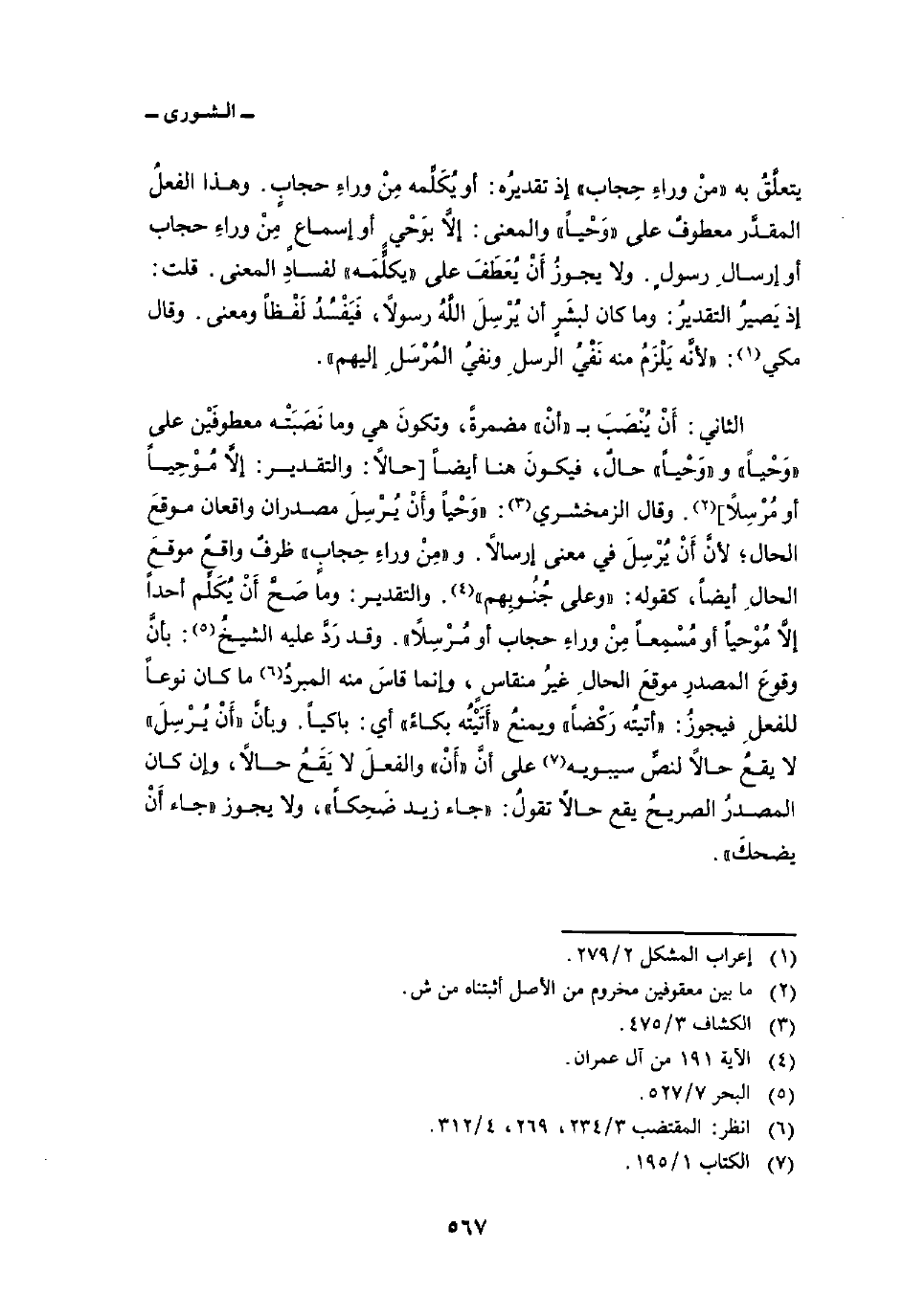 الثاني: أَنْ يُنْصَبَ ب «أنْ» مضمرةً، وتكونَ هي وما نَصَبَتْه معطوفَيْن على «وَحْياً» و «وَحْياً» حالٌ، فيكونَ هنا أيضاً [حالاً: والتقدير: إلاَّ مُوْحِياً أو مُرْسِلاً] . وقال الزمخشري: «وَحْياً وأَنْ يُرْسِلَ مصدران واقعان موقعَ الحال؛ لأنَّ أَنْ يُرْسِلَ في معنى إرسالاً. و {مِن وَرَآءِ حِجَابٍ} ظرفٌ واقعٌ موقعَ الحالِ أيضاً، كقوله: {وعلى جُنُوبِهِمْ} [آل عمران: 191] . والتقدير: وما صَحَّ أَنْ يُكَلَّم أحداً إلاَّ مُوْحياً أو مُسْمِعاً مِنْ وراءِ حجاب أو مُرسِلاً» . وقد رَدَّ عليه الشيخُ: بأنَّ وقوعَ المصدرِ موقعَ الحالِ غيرُ منقاسٍ، وإنما قاسَ منه المبردُ ما كان نوعاً للفعلِ فيجوزُ: «أتيتُه رَكْضاً» ويمنعُ «أَتَيْتُه بكاءً» أي: باكياً.