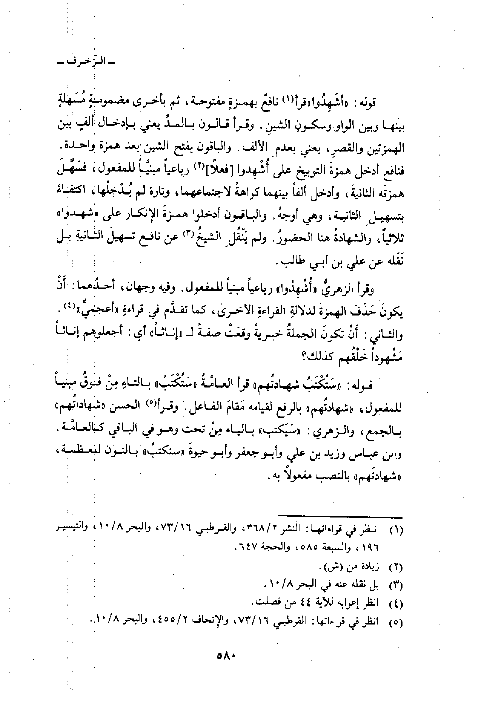 وقرأ الزهريُّ «أُشْهِدُوا» رباعياً مبنياً للمفعول. وفيه وجهان، أحدُهما: أَنْ يكونَ حَذَفَ الهمزةَ لدلالةِ القراءةِ الأخرى، كما تقدَّم في قراءةِ «أعجميٌّ» . والثاني: أَنْ تكونَ الجملةُ خبريةً وقعَتْ صفةً ل «إناثاً» أي: أجعلوهم إناثاً مَشْهوداً خَلْقُهم كذلك؟