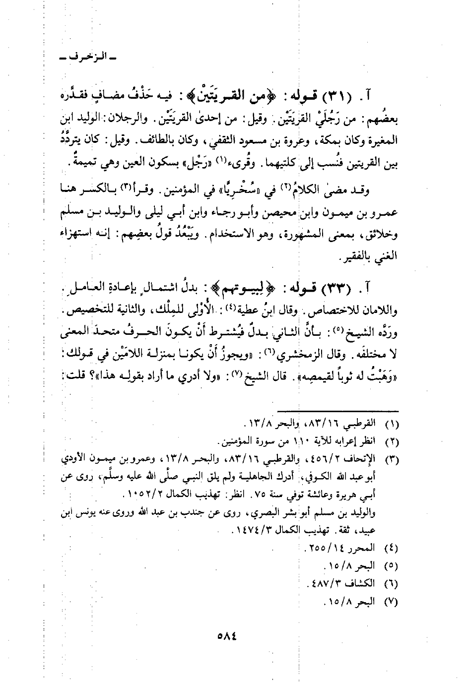 قوله: {مِّنَ القريتين} : فيه حَذْفُ مضافٍ فقدَّره بعضُهم: من رَجُلَيْ القريَتَيْن. وقيل: من إحدى القريَتَيْن. والرجلان: الوليد ابن المغيرة وكان بمكة، وعروة بن مسعود الثقفي، وكان بالطائف. وقيل: كان يتردَّدُ بين القريتين فنُسب إلى كلتيهما. وقُرئ «رَجْل» بسكون العين وهي تميمةٌ.