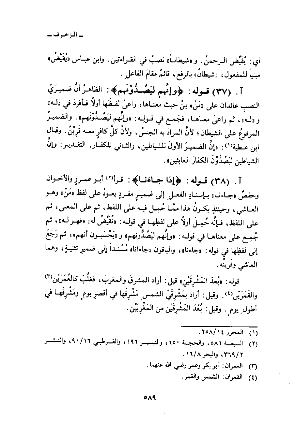 قوله: {وَإِنَّهُمْ لَيَصُدُّونَهُمْ} : الظاهرُ أنَّ ضميرَيْ النصبِ عائدان على «مَنْ» مِنْ حيث معناها، راعى لفظَها أولاً فأفردَ في «له» و «له» ، ثم راعى معناها، فجَمع في قولِه: «وإنَّهم ليَصُدُّوْنَهم» . والضميرُ المرفوعُ على الشيطان؛ لأنَّ المرادَ به الجنسُ، ولأنَّ كلَّ كافرٍ معه قَرِيْنٌ. وقال ابن عطية: «إنَّ الضميرَ الأولَ للشياطين، والثاني للكفار. التقدير: وإنَّ الشياطين ليَصُدُّوْنَ الكفارَ العابثين» .