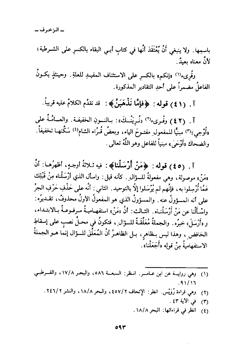 وقُرئ «نُرِيَنْكَ» : بالنونِ الخفيفة. والعامَّةُ على {أُوحِيَ} [الزخرف: 43] مبنيًّا للمفعولِ مفتوحَ الياء، وبعضُ قرَّاء الشام سَكَّنها تخفيفاً. والضحاك «أَوْحَى» مبنياً للفاعل وهو اللَّهُ تعالى.
