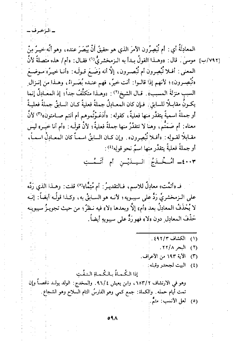 4003 - أمُخْدَجُ اليدَيْنِ أم أَتَمَّتِ ... ف «أتمَّت» معادِلٌ للاسم، فالتقديرُ: أم مُتِمًّا «قلت: وهذا الذي رَدَّه على الزمخشريِّ رَدٌّ على سيبويه؛ لأنه هو السابقُ به، وكذا قولُه أيضاً: إنه لا يُحْذَفُ المعادِلُ بعد» أم «إلاَّ وبعدها» لا «فيه نظرٌ؛ من حيث تجويزُ سيبويه حَذْفُ المعادِلِ دون» لا «فهو رَدٌّ على سيبويهِ أيضاً.