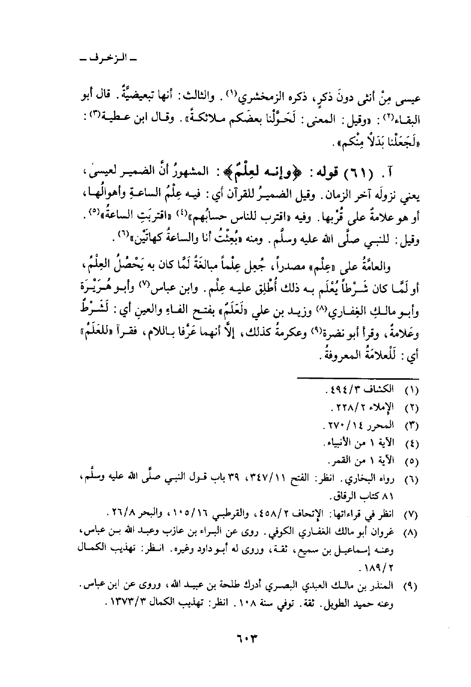 قوله: {وَإِنَّهُ لَعِلْمٌ} : المشهورُ أنَّ الضمير لعيسى، يعني نزولَه آخر الزمان. وقيل الضميرُ للقرآن أي: فيه عِلْمُ الساعةِ وأهوالُها، أو هو علامةٌ على قُرْبها. وفيه {اقترب لِلنَّاسِ حِسَابُهُمْ} [الأنبياء: 1] {اقتربت الساعة} [القمر: 1] . وقيل: للنبي صلَّى الله عليه وسلَّم. ومنه «بُعِثْت أنا والساعةُ كهاتَيْن» .