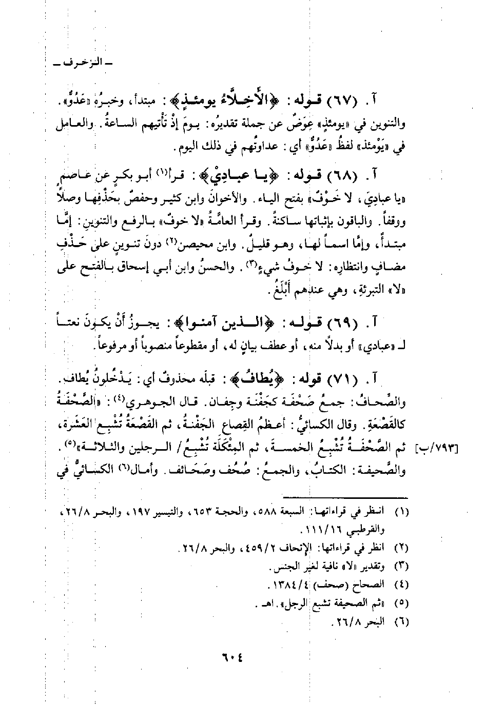 قوله: {يُطَافُ} : قبلَه محذوفٌ أي: يَدْخُلونُ يُطاف. والصِّحافُ: جمعُ صَحْفَة كجَفْنَة وجِفان. قال الجوهري: «الصَّحْفَةُ كالقَصْعَةِ. وقال الكسائيُّ: أعظمُ القَصاعِ الجَفْنةُ، ثم القَصْعَةُ تُشْبِع العَشَرة، ثم الصَّحْفَةُ تُشْبِعُ الخمسةَ، ثم المِئْكَلَة تُشْبِعُ/ الرجلين والثلاثة» . والصَّحيفة: الكتابُ، والجمعُ: صُحُف وصَحَائف. وأمال الكسائيُّ في