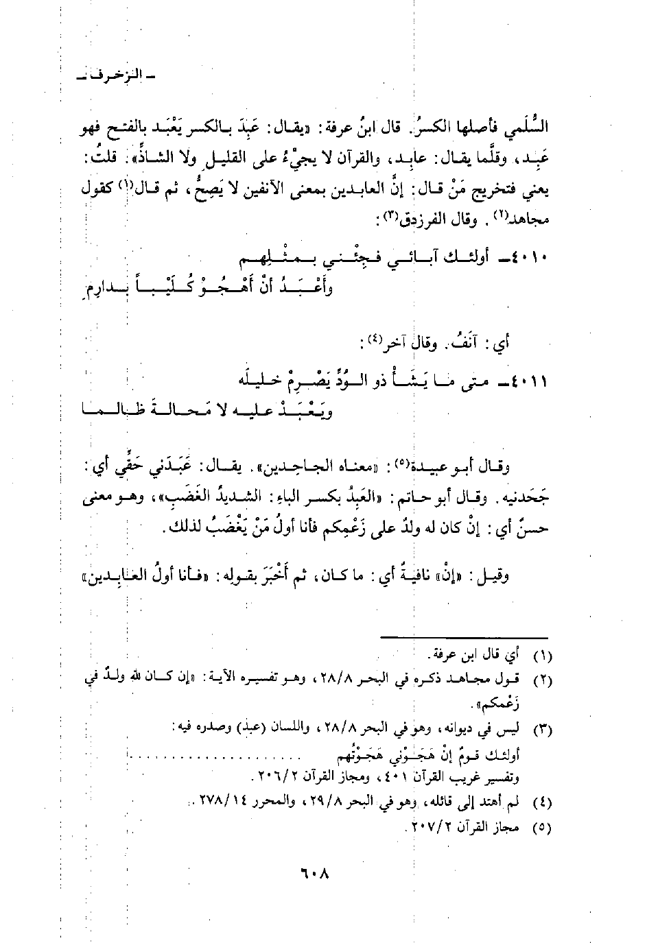 وقال أبو عبيدة: «معناه الجاحِدين» . يقال: عَبَدَني حَقِّي أي: جَحَدنيه. وقال أبو حاتم: «العَبِدُ بكسر الباءِ: الشديدُ الغَضَبِ» ، وهو معنى حسنٌ أي: إنْ كان له ولدٌ على زَعْمِكم فأنا أولُ مَنْ يَغْضَبُ لذلك.