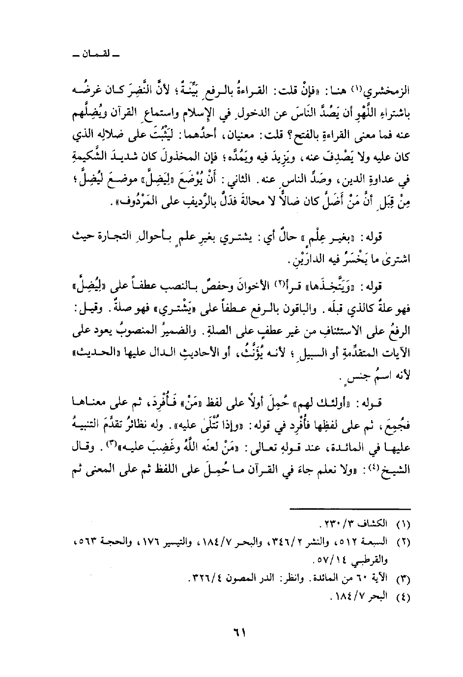 الزمخشري هنا: «فإنْ قلت: القراءةُ بالرفعِ بَيِّنَةٌ؛ لأنَّ النَّضِرَ كان غرضُه باشتراءِ اللَّهْوِ أن يَصُدَّ النَاسَ عن الدخولِ في الإِسلام واستماعِ القرآن ويُضِلَّهم عنه فما معنى القراءةِ بالفتح؟ قلت: معنيان، أحدُهما: ليَثْبُتَ على ضلالِه الذي كان عليه ولا يَصْدِفَ عنه، ويَزِيدَ فيه ويَمُدَّه؛ فإن المخذولَ كان شديدَ الشَّكيمةِ في عداوةِ الدين، وصَدِّ الناسِ عنه. الثاني: أَنْ يُوْضَعَ» لِيَضِلَّ «موضعَ ليُضِلَّ؛ مِنْ قِبَلِ أنَّ مَنْ أَضَلَّ كان ضالاًّ لا محالةَ فدَلَّ بالرَّديفِ على المَرْدُوف» .